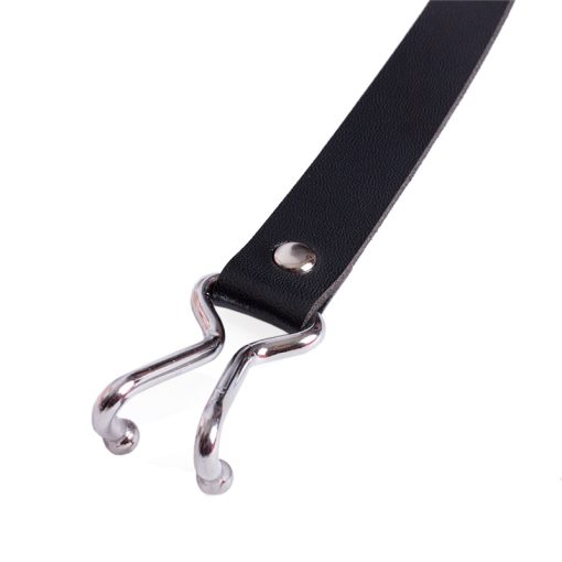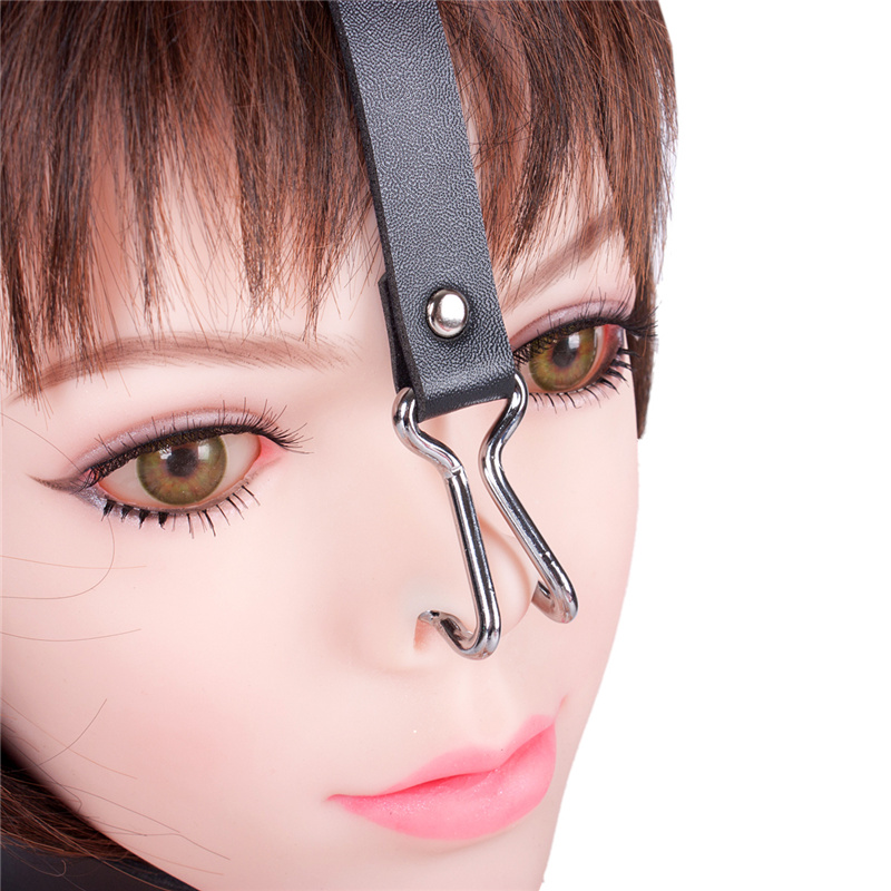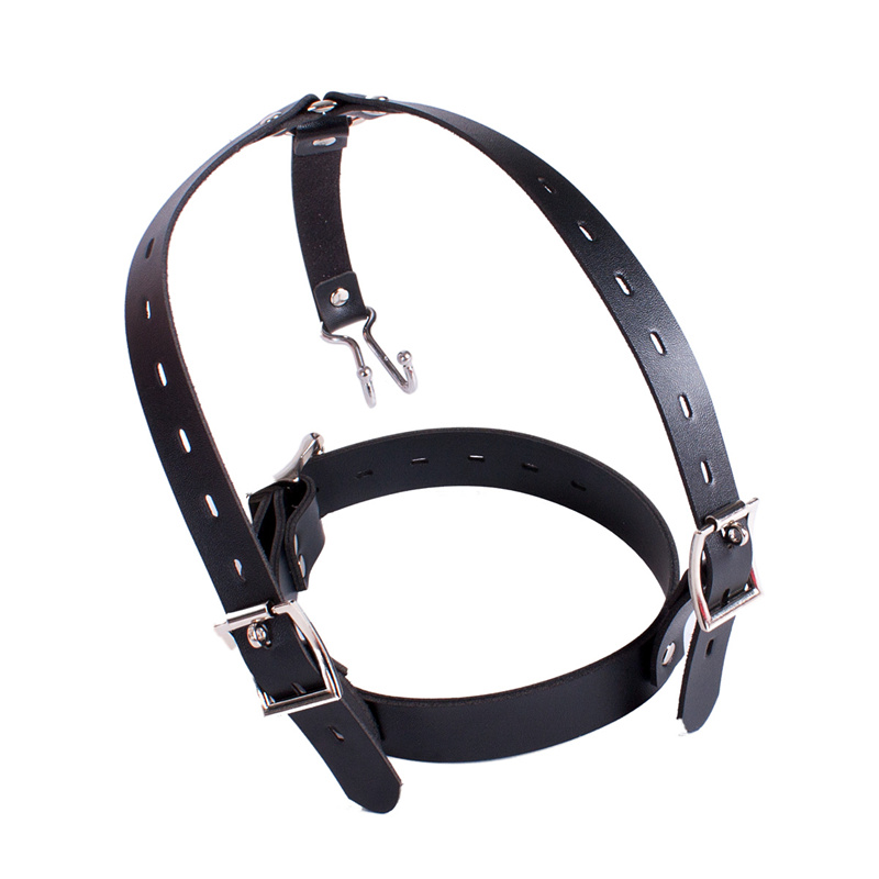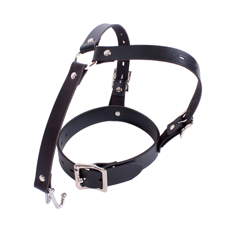 Máscaras de couro em formato triangular com ganchos para o nariz. Estes ganchos servem para que garanta que a pessoa está “respirando adequadamente”, além de manter a máscara firme no lugar devido. Torne seu escravo sorridente e com lábios bem abertos com os ganchos na posição adequada.