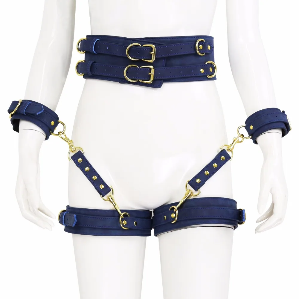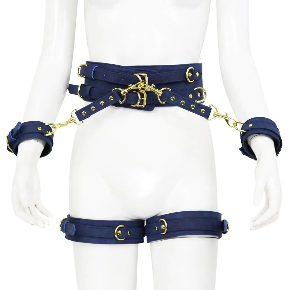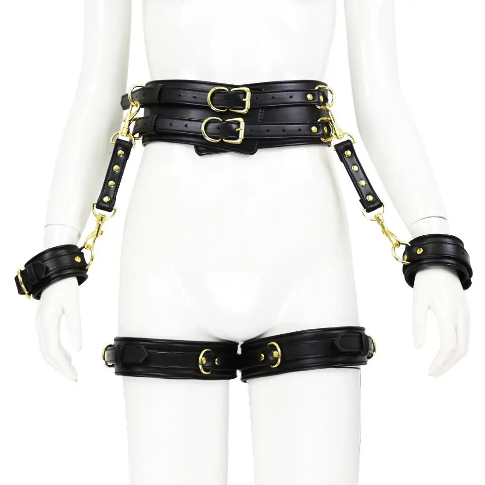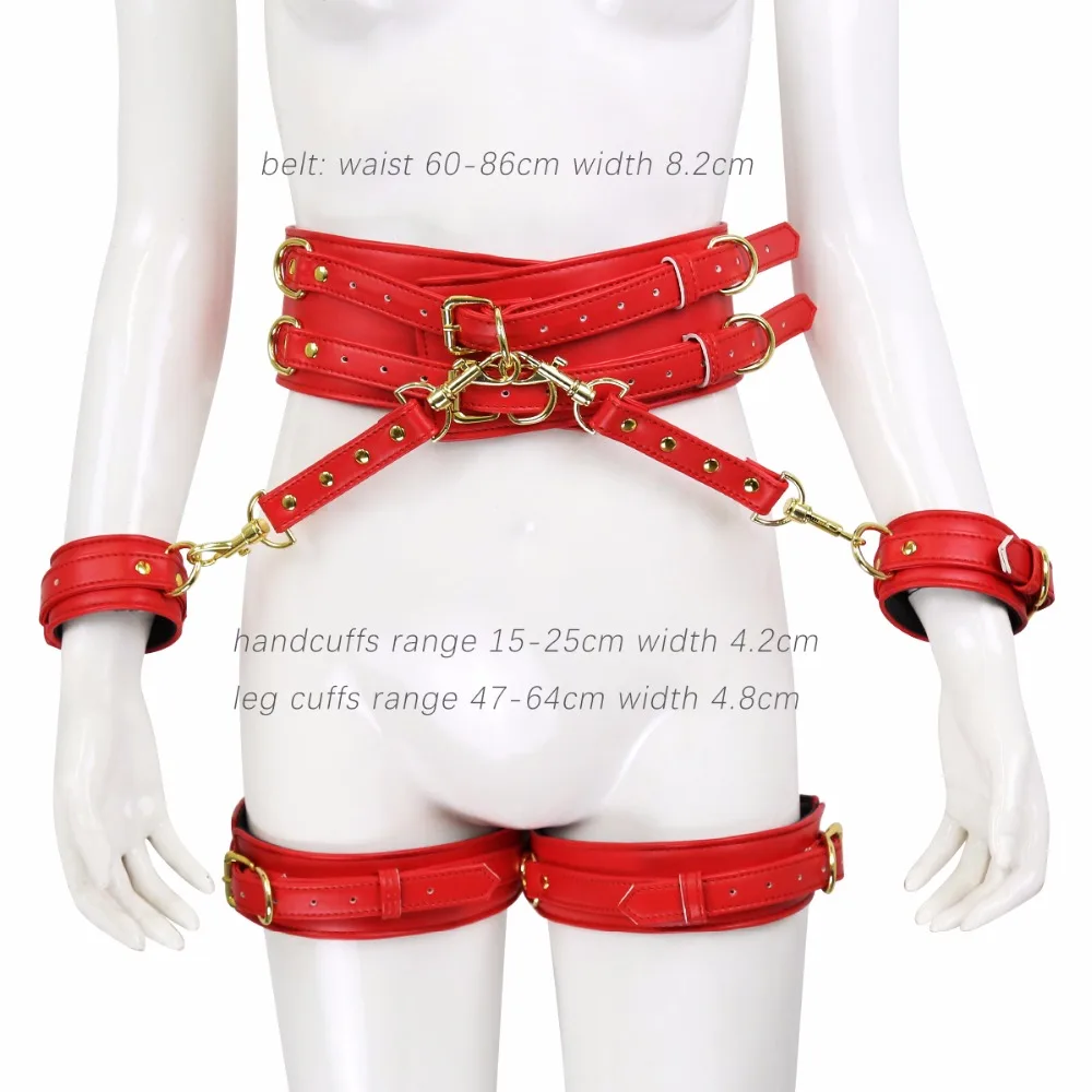 Conjunto Algemas Couro Perna Cinto Leather Handcuffs Leg Cuffs Waist Belt: Descubra um universo de possibilidades com este conjunto projetado para práticas de bondage que combinam estilo, conforto e versatilidade. Este conjunto inclui um cinto, quatro algemas ajustáveis e uma peça de conexão, oferecendo inúmeras opções para explorar posições e jogos de submissão.