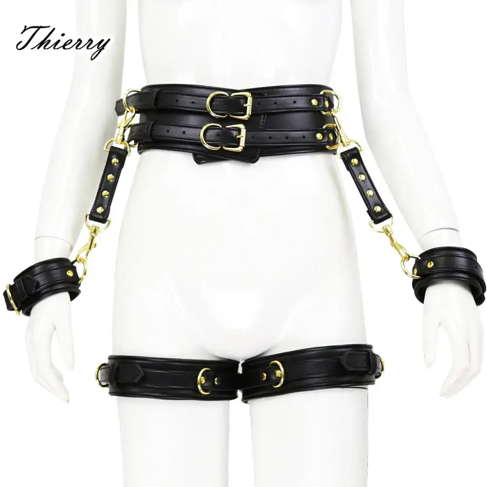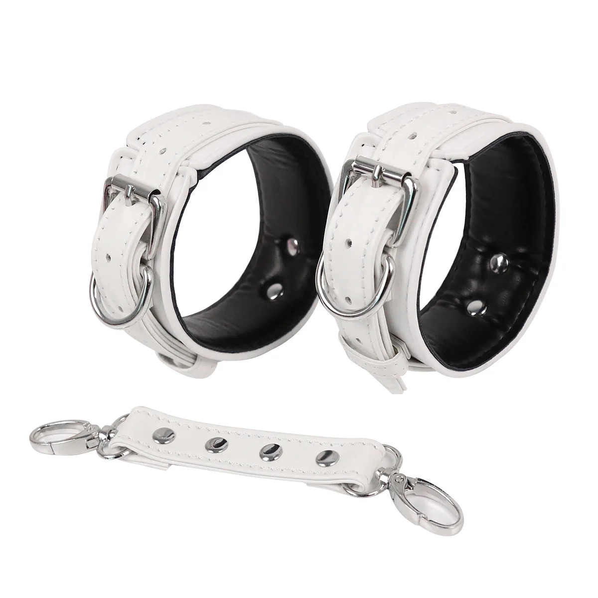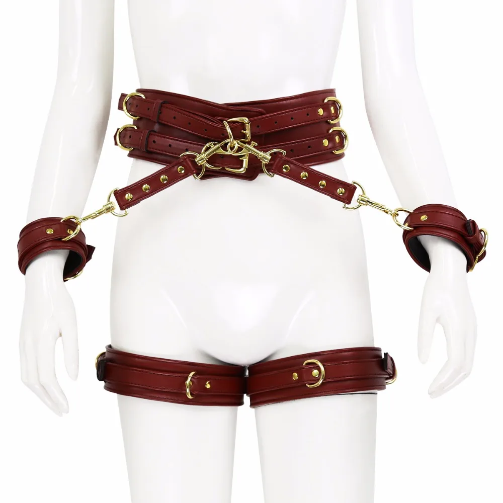 Conjunto Algemas Couro Perna Cinto Leather Handcuffs Leg Cuffs Waist Belt: Descubra um universo de possibilidades com este conjunto projetado para práticas de bondage que combinam estilo, conforto e versatilidade. Este conjunto inclui um cinto, quatro algemas ajustáveis e uma peça de conexão, oferecendo inúmeras opções para explorar posições e jogos de submissão.