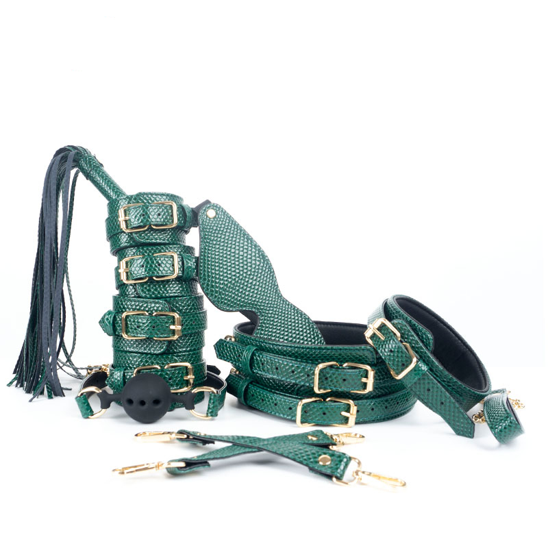 Conjunto para fetiches ou BDSM com estampa de cobra. 7 ou 8 itens opcionais.