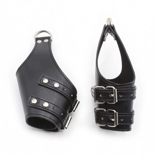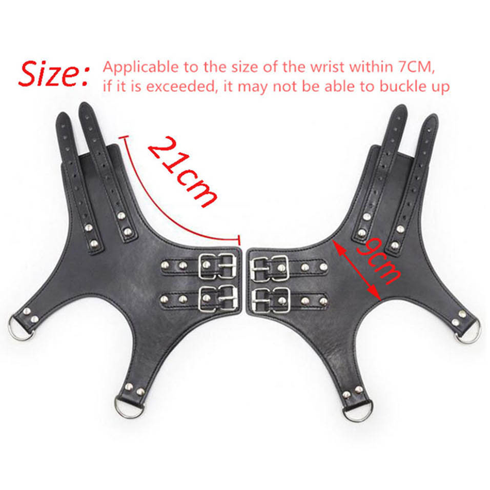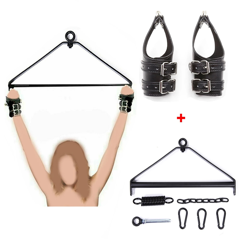 Os item de couro das algemas possuem ganchos nas partes de trás dos pontos de apoio. Isto significa que você prenderá a barra perto dos cotovelos do seu par submisso. Isto vai exigir maior flexibilidade da pessoa que for presa na barra. Será mais difícil para quem estiver preso de se soltar, caso decida tentar escapar.