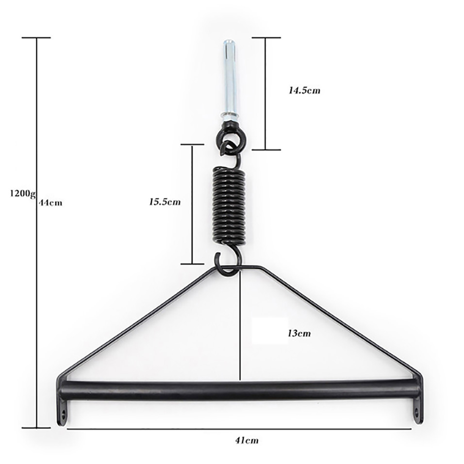 São algemas que podem ser fixadas em uma barra de metal inoxidável com formato de cabide. Tamanho da barra de 41 cm de largura e 13 cm de altura. A mola e o parafuso de parabolt têm tamanhos que somam todas as peças até 37 cm de altura. Considere a mola relaxada e o parabolt fixado na furação desejada.