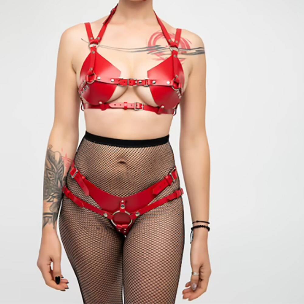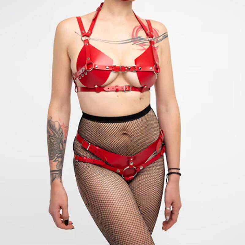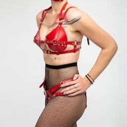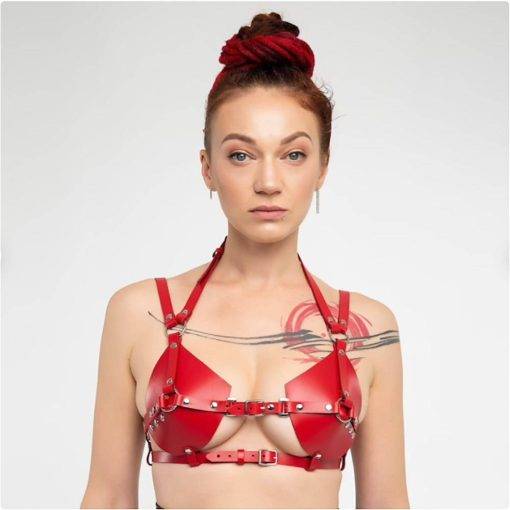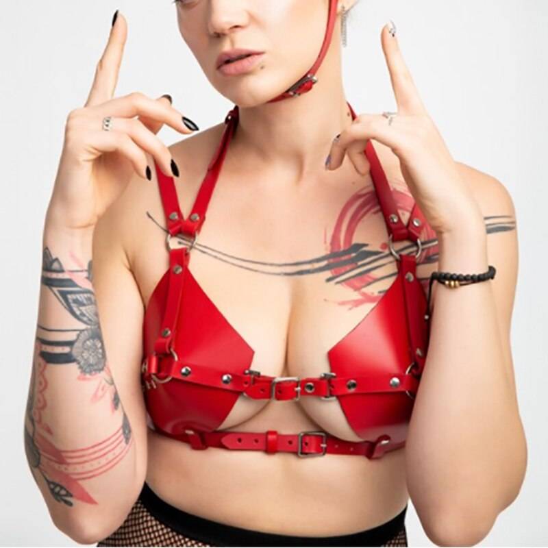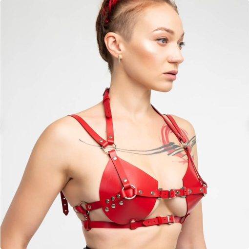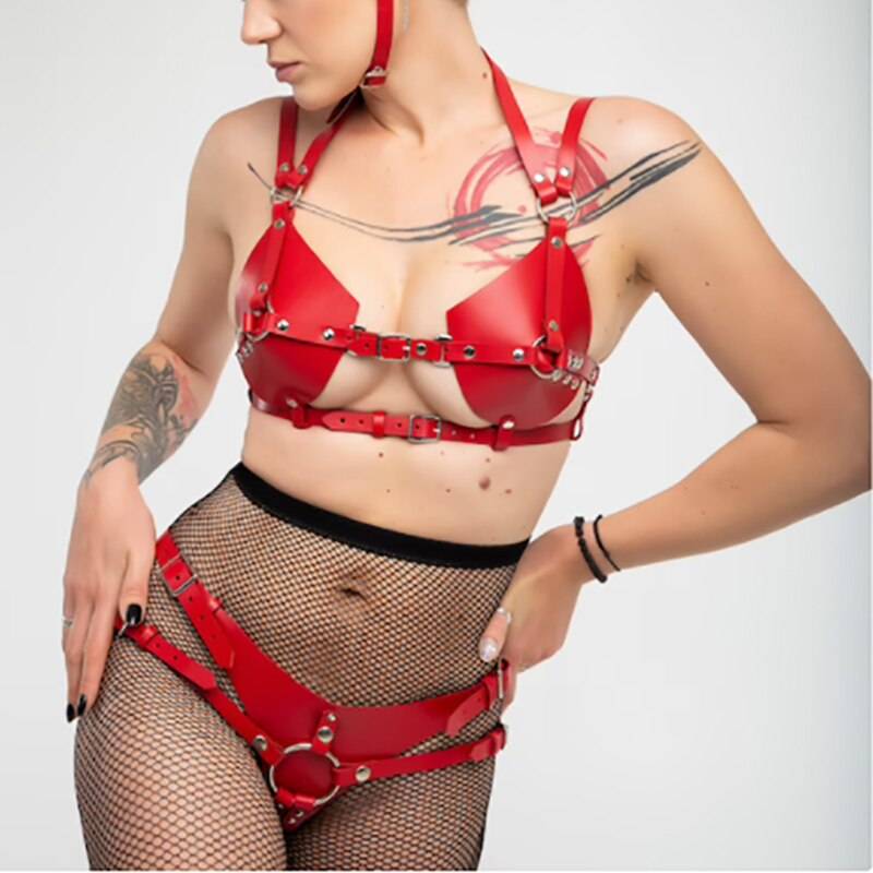Arnês de correia de couro, parafusos de metal e anéis, fivelas ajustáveis;