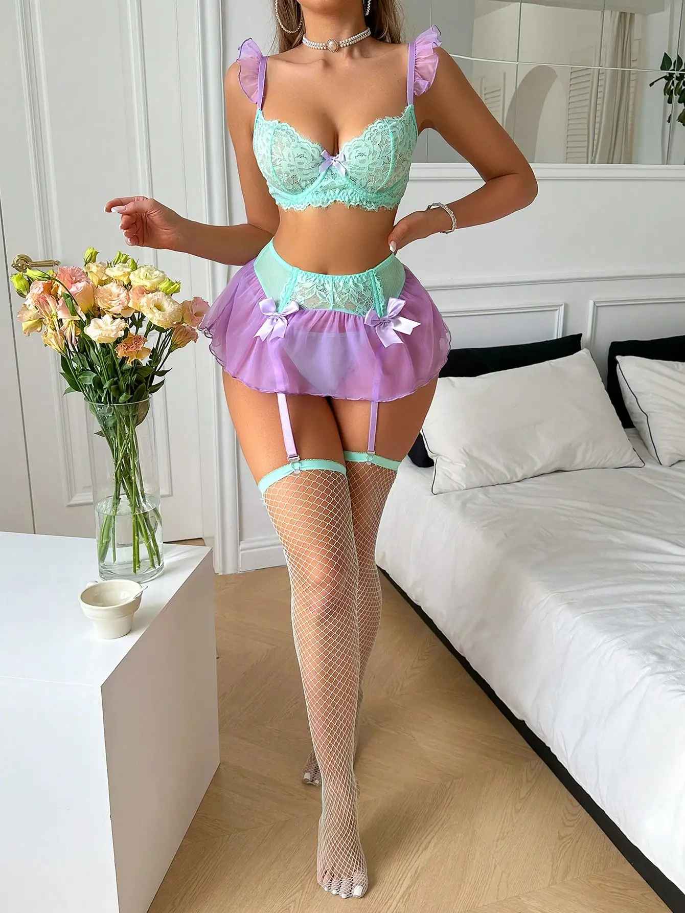 Conjunto de Lingerie Sexy Ellolace com Tule, Renda e Cinta-Liga – Estilo Romântico e Sensual