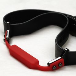 Mordaça de couro regulável com cinta grossa de couro. As tiras de couro têm 3 cm de altura, aproximadamente. A cinta de couro pode ser regulada com precisão, pois não trabalha com sistema de furações, mas sim com fivelas corrediças com pressão.