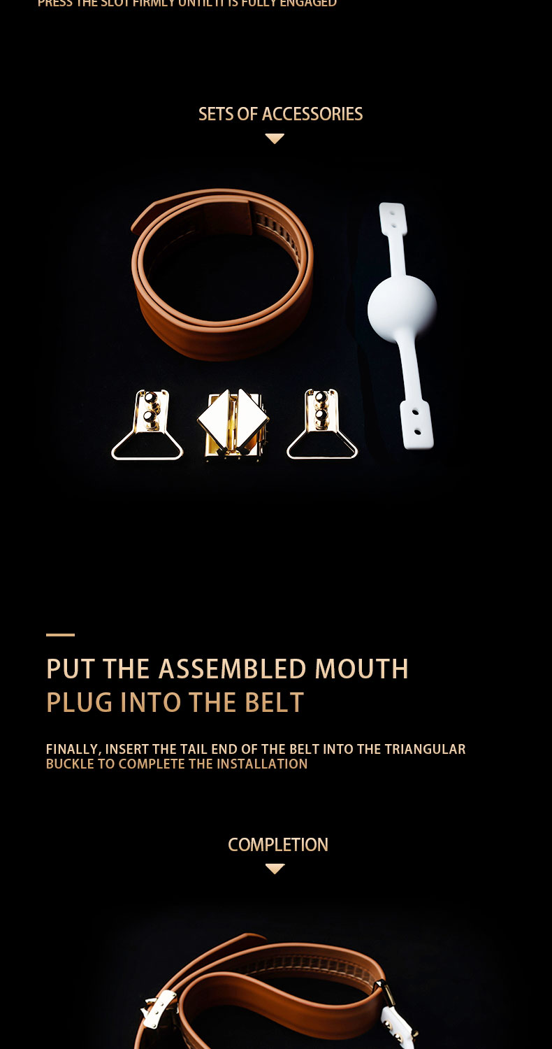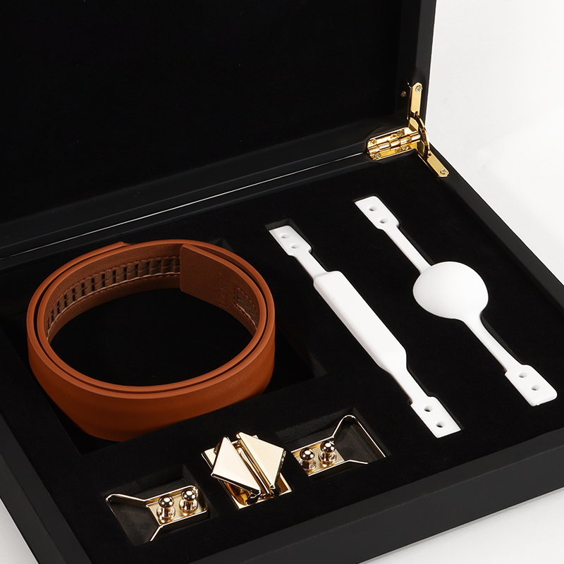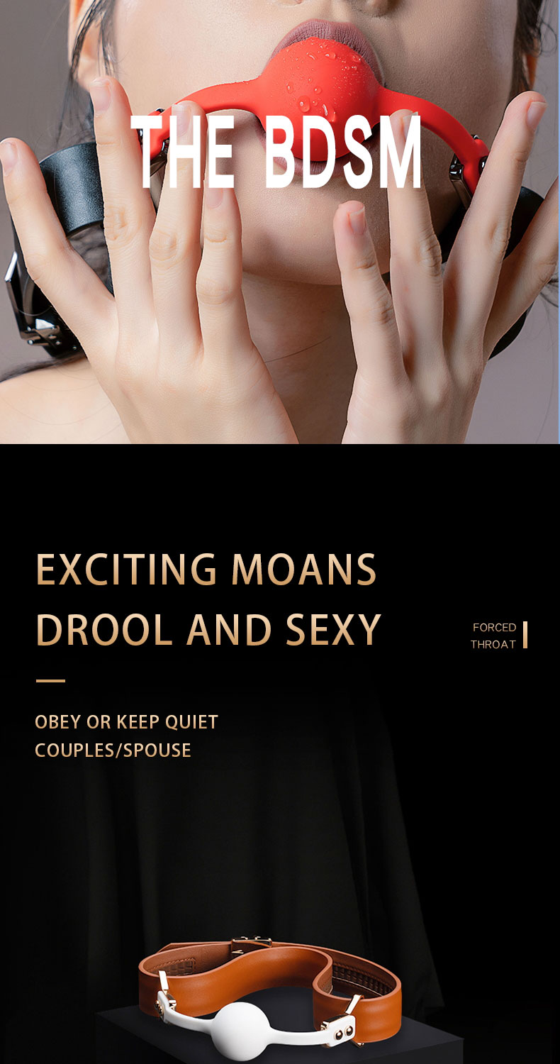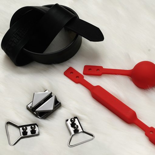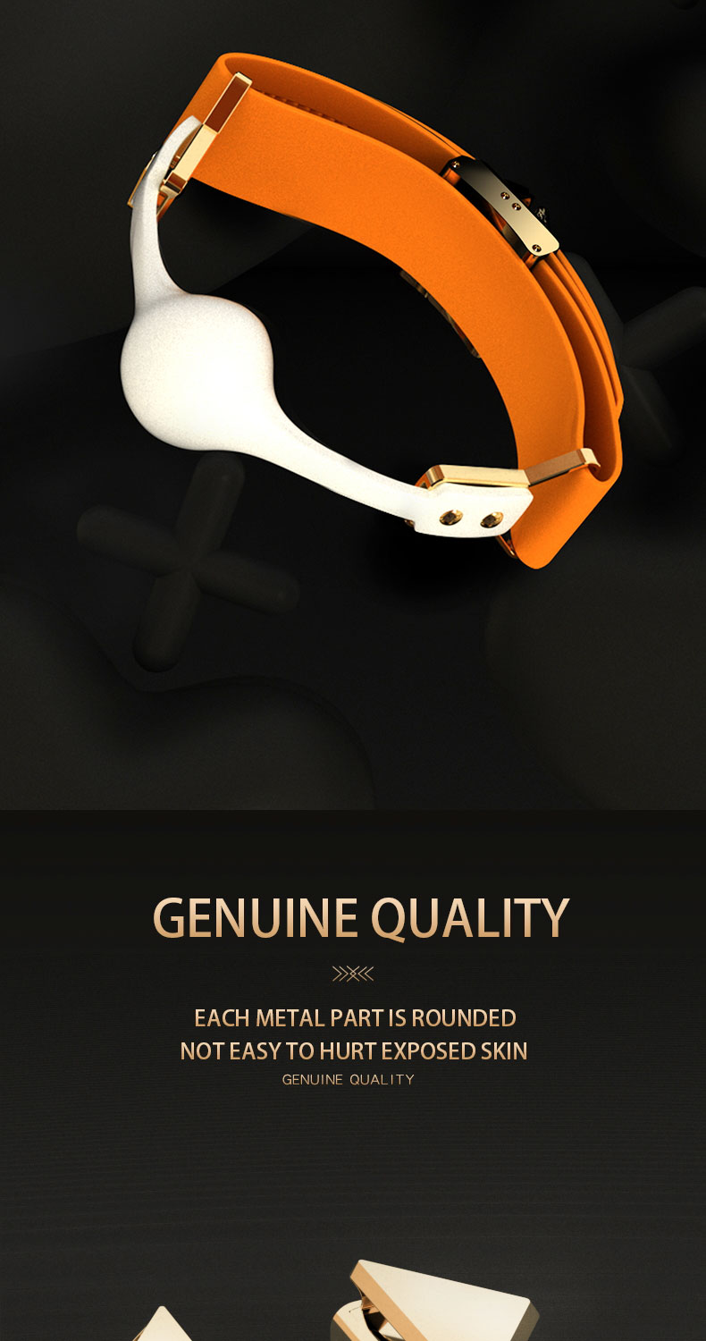 Mordaças com redondas e retangulares, que acompanham um conjunto de incrível beleza e eficiência. Este conjunto possui sistema de fechamento por abotoaduras e por fivelas corrediças de beleza única. Além dos formatos, as cores são magníficas, tendo opções de couro marrom, com mordaças de silicone brancas, e preto, com mordaças nas cores vermelhas. Os detalhes metálicos correspondentes são dourados ou pretos.