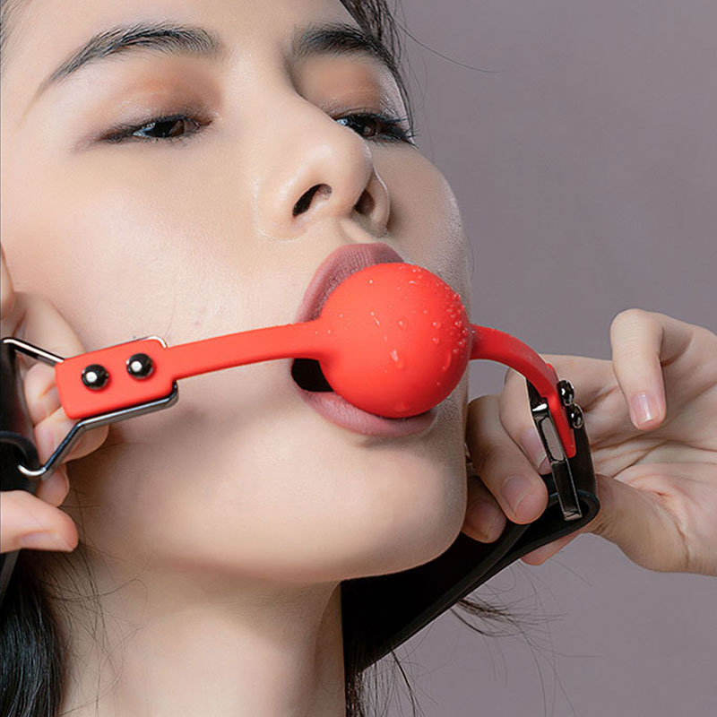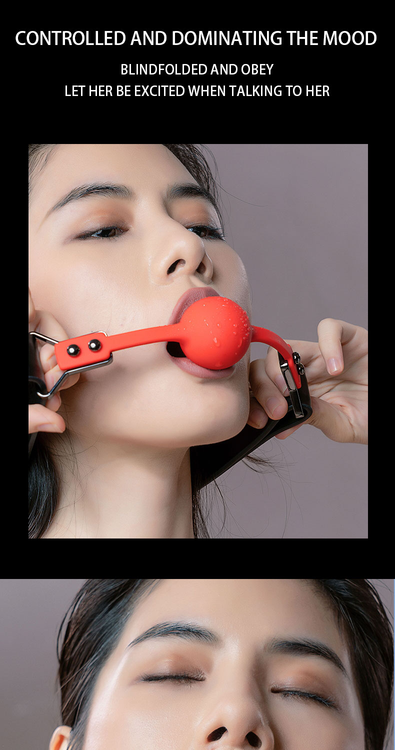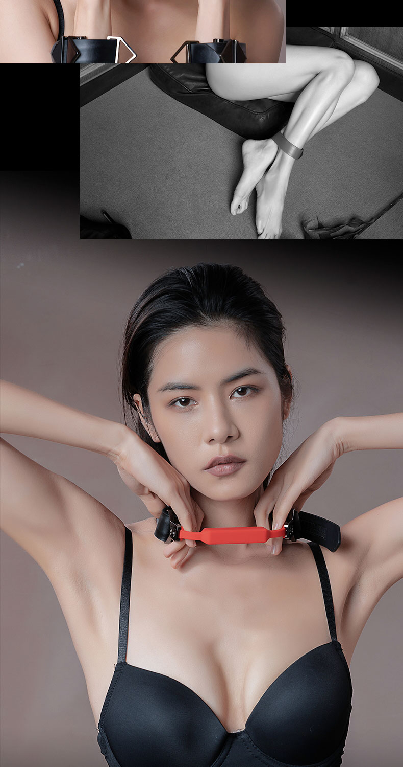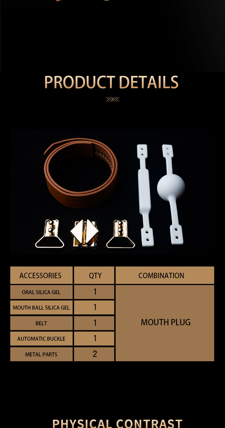 Mordaças com redondas e retangulares, que acompanham um conjunto de incrível beleza e eficiência. Este conjunto possui sistema de fechamento por abotoaduras e por fivelas corrediças de beleza única. Além dos formatos, as cores são magníficas, tendo opções de couro marrom, com mordaças de silicone brancas, e preto, com mordaças nas cores vermelhas. Os detalhes metálicos correspondentes são dourados ou pretos.
