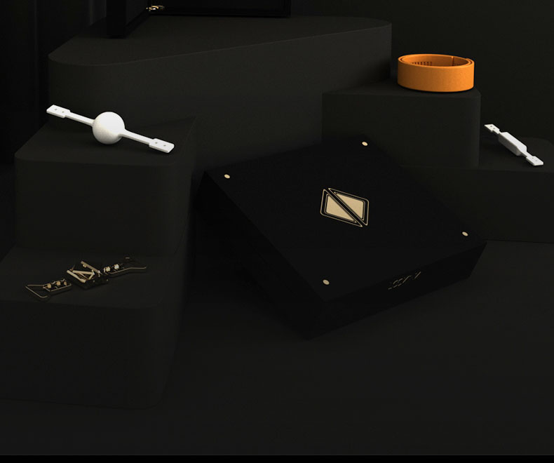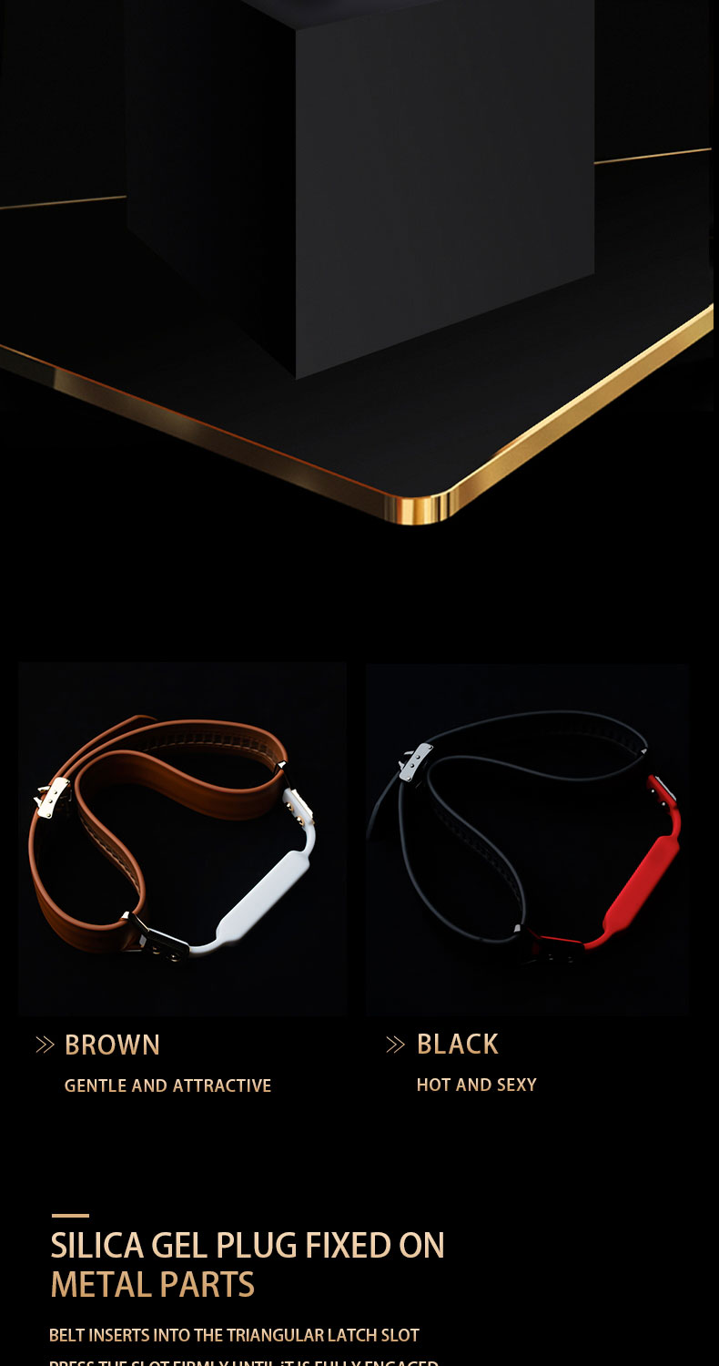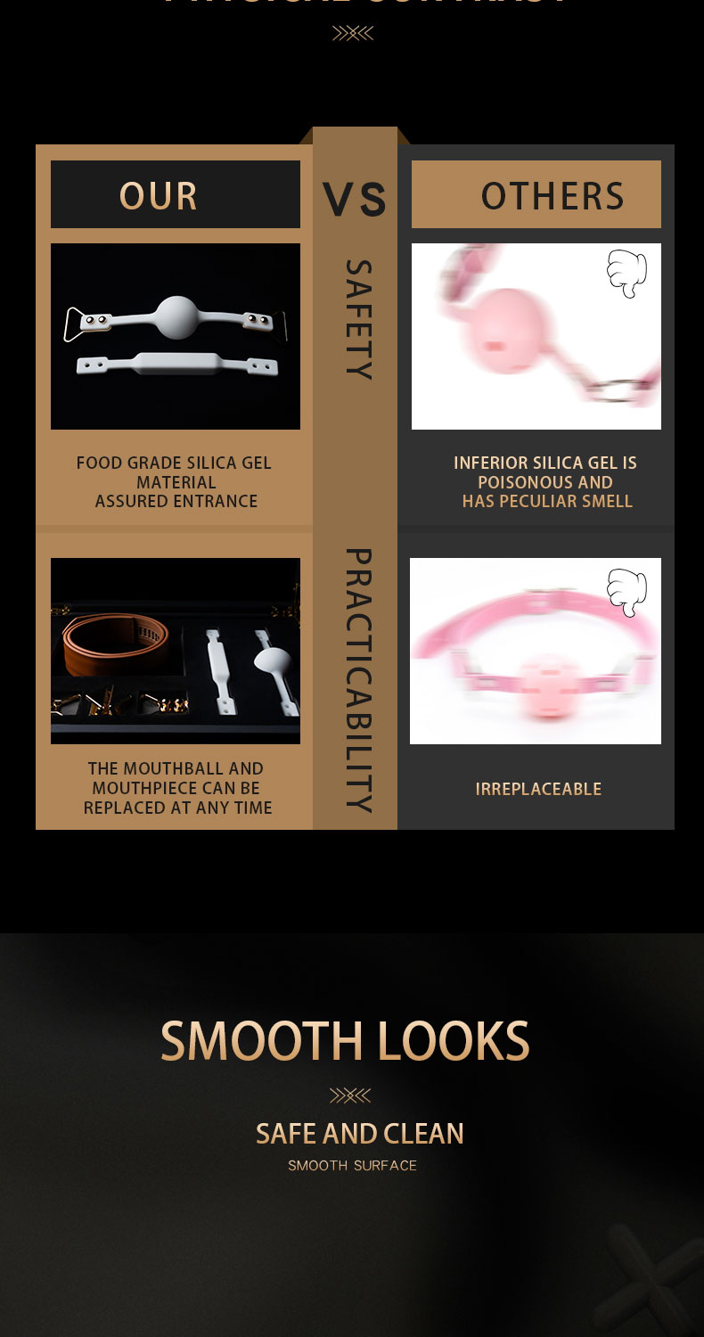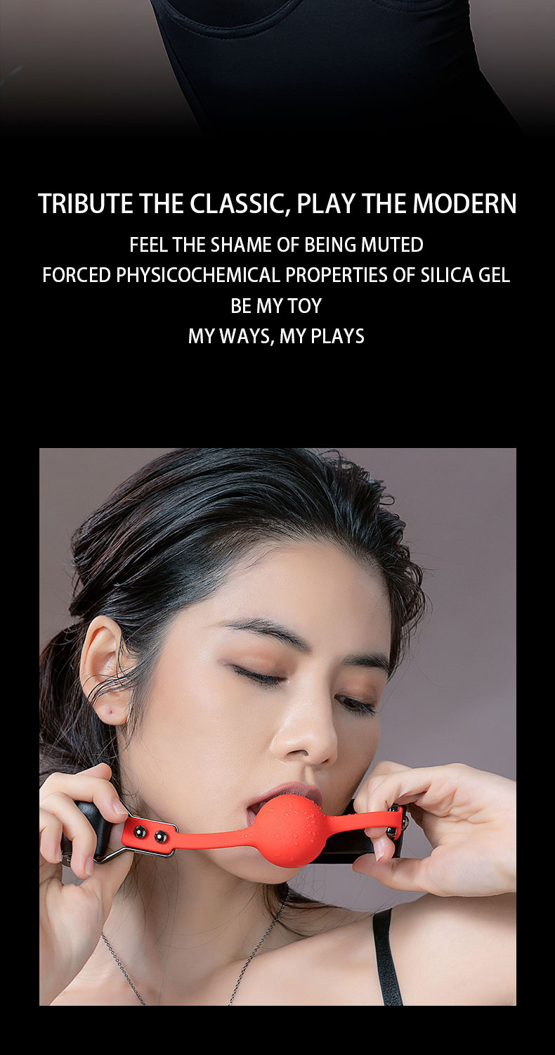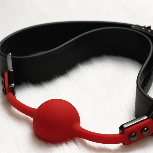 Mordaças com redondas e retangulares, que acompanham um conjunto de incrível beleza e eficiência. Este conjunto possui sistema de fechamento por abotoaduras e por fivelas corrediças de beleza única. Além dos formatos, as cores são magníficas, tendo opções de couro marrom, com mordaças de silicone brancas, e preto, com mordaças nas cores vermelhas. Os detalhes metálicos correspondentes são dourados ou pretos.