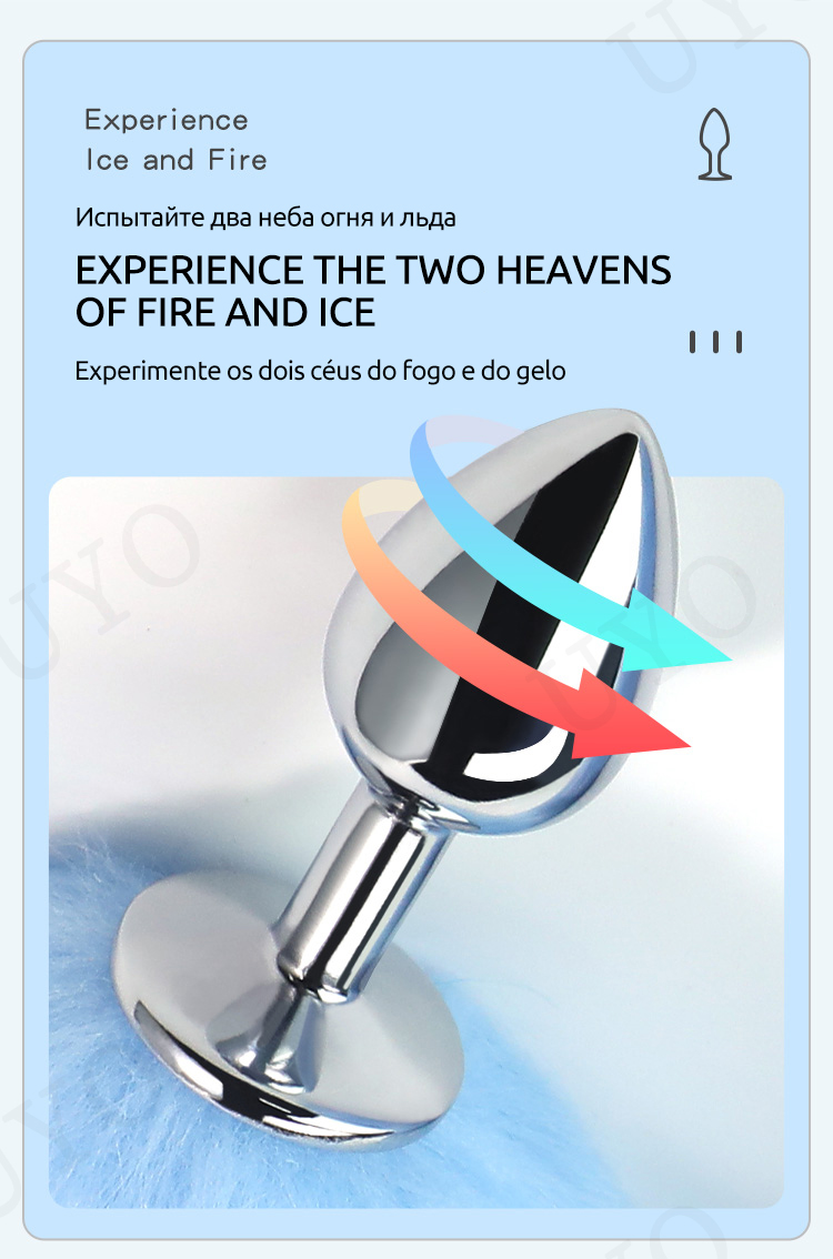 A gargantilha tem medidas de 39,5 cm de circunferência. Tem 1,6 cm de altura para a tira de couro e argola com 3 cm de diâmetro. O plug anal tem 6,8 cm de altura e 2,7 cm de diâmetro.