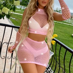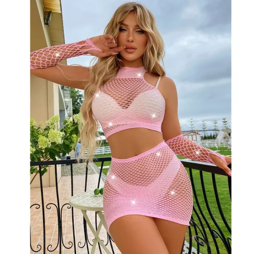 Brilhe e seduza com o Conjunto Saia e Top com Diamantes! Com detalhes que imitam pedras brilhantes, essa lingerie transforma o visual com muito glamour e ousadia. O top e a saia ajustam-se ao corpo valorizando suas curvas, enquanto os detalhes reluzentes destacam sua sensualidade em momentos especiais. Ideal para quem quer surpreender e se sentir irresistível, com um toque luxuoso e provocante.