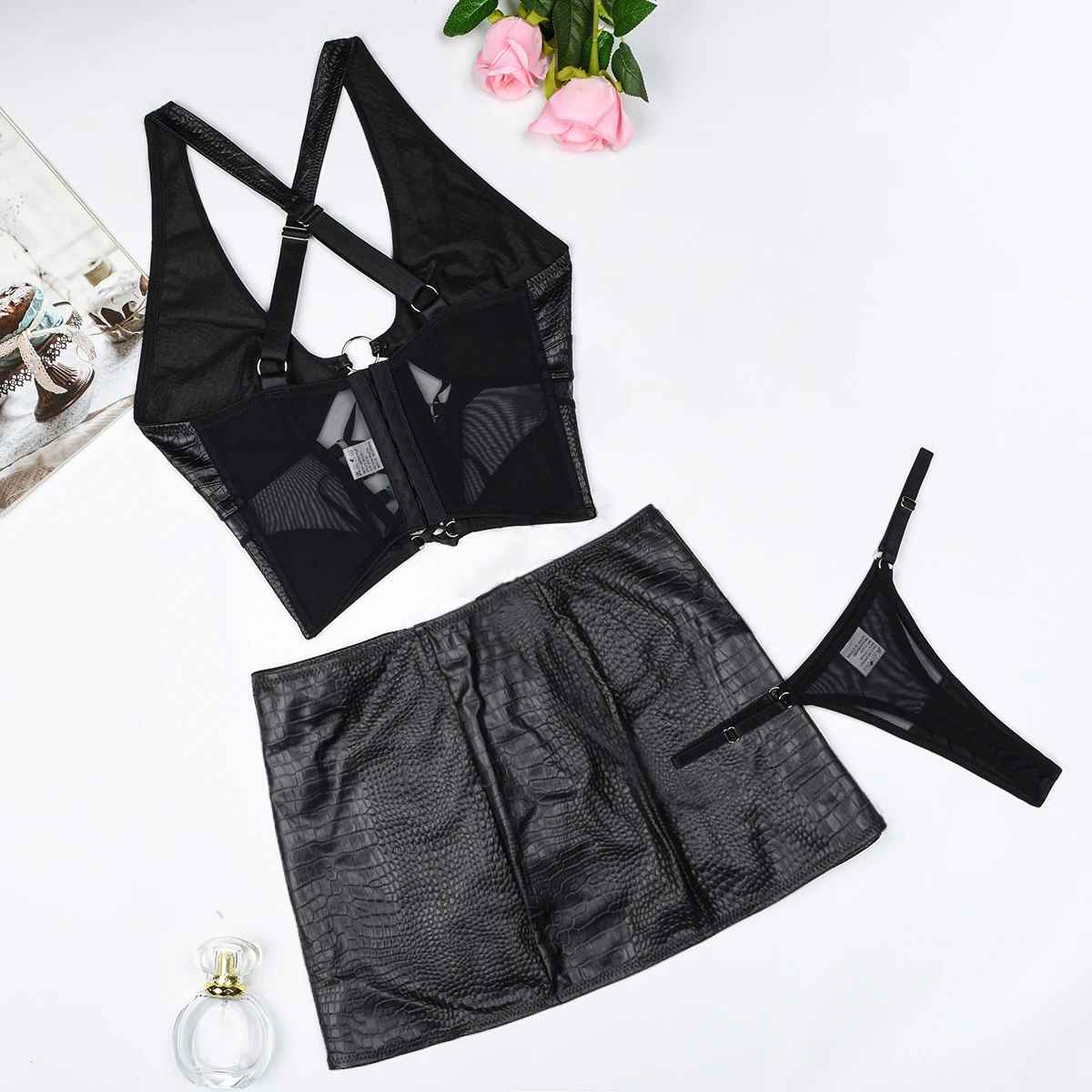 Conjunto Sexy com Mini Saia de Couro Ellolace – Lingerie Fetiche 2 Peças com Sutiã Cruzado