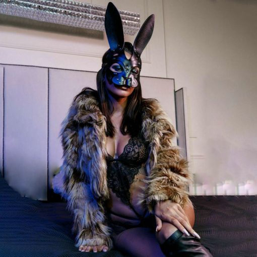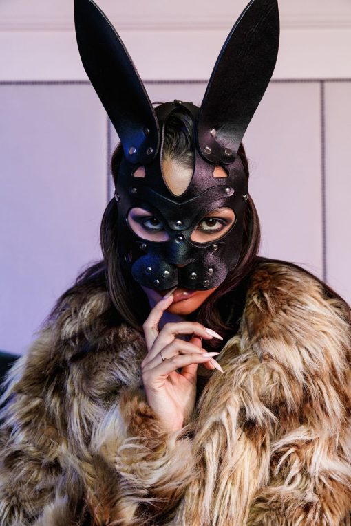Máscaras de couro com formatos de cabeça de coelho, com grandes orelhas. O que que há, velhinho? Há tesão, luxo, beleza e mistério.