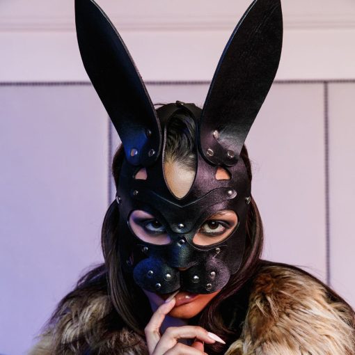 Máscara de coelho negra de couro, com detalhes metálicos. Fantasia e fetiche animal de coelho.