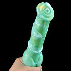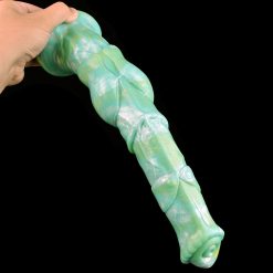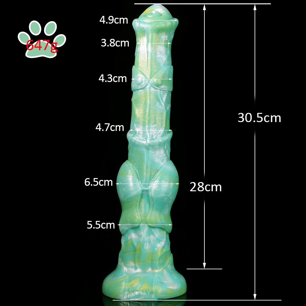 São 30,5 cm de comprimento. Grossura que varia de 3,8 cm até 6,5 cm de diâmetro para os segmentos ao longo do dildo.