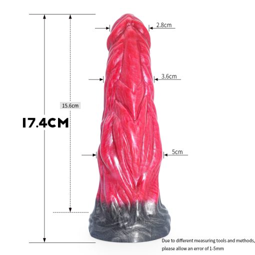 Possui 17,4 cm de altura total e 15,6 cm de área inserível. Um pênis bombado! A grossura é crescente, com ponta de 2,8 cm e vai até a base de 5 cm de diâmetro.
