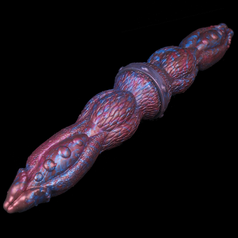 Dildo duplo com formas idênticas, ideal para uso de casais. Textura porosa e escamosa.
