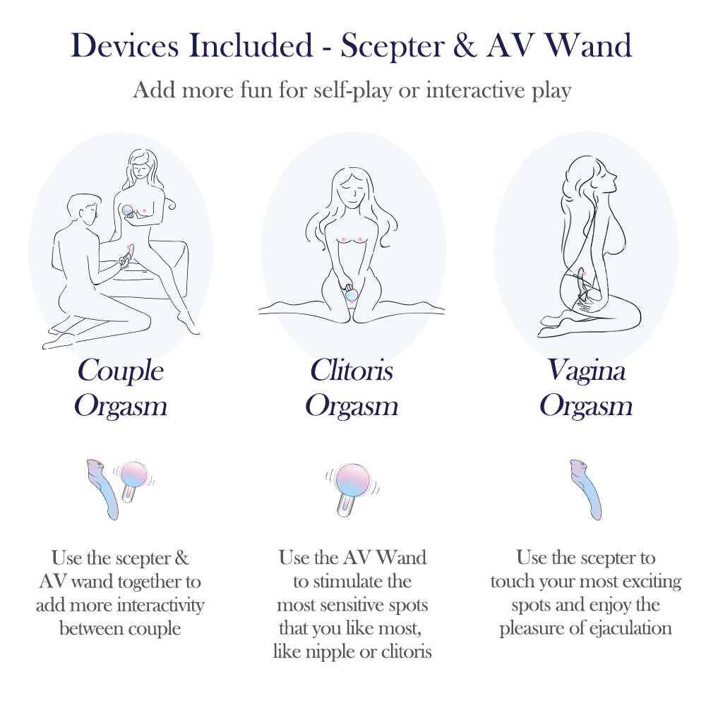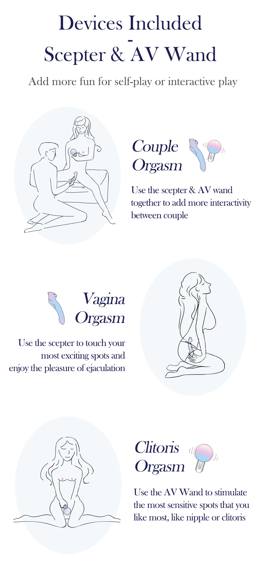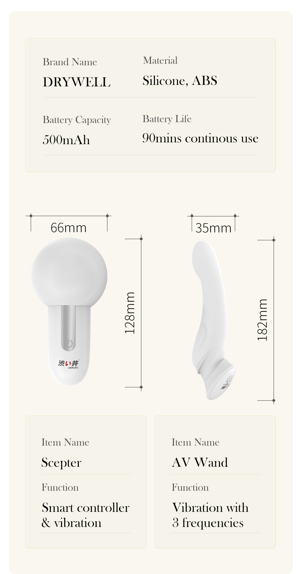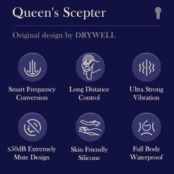 Um vibrador em formato de pequena bola vibratória, controlado pelo cetro da sua realeza. A vara pequena com cabeça arredondada vibra, enquanto o cetro pode ser usado para penetrar e controlar a vibração. Uma rainha pode usar as duas mãos com maestria, ou ordenar seu súdito a realizar as suas vontades. Com traços suaves, curvados e arredondados, especial para massagear com precisão seu ponto G, tanto masculino quanto feminino.