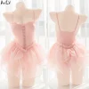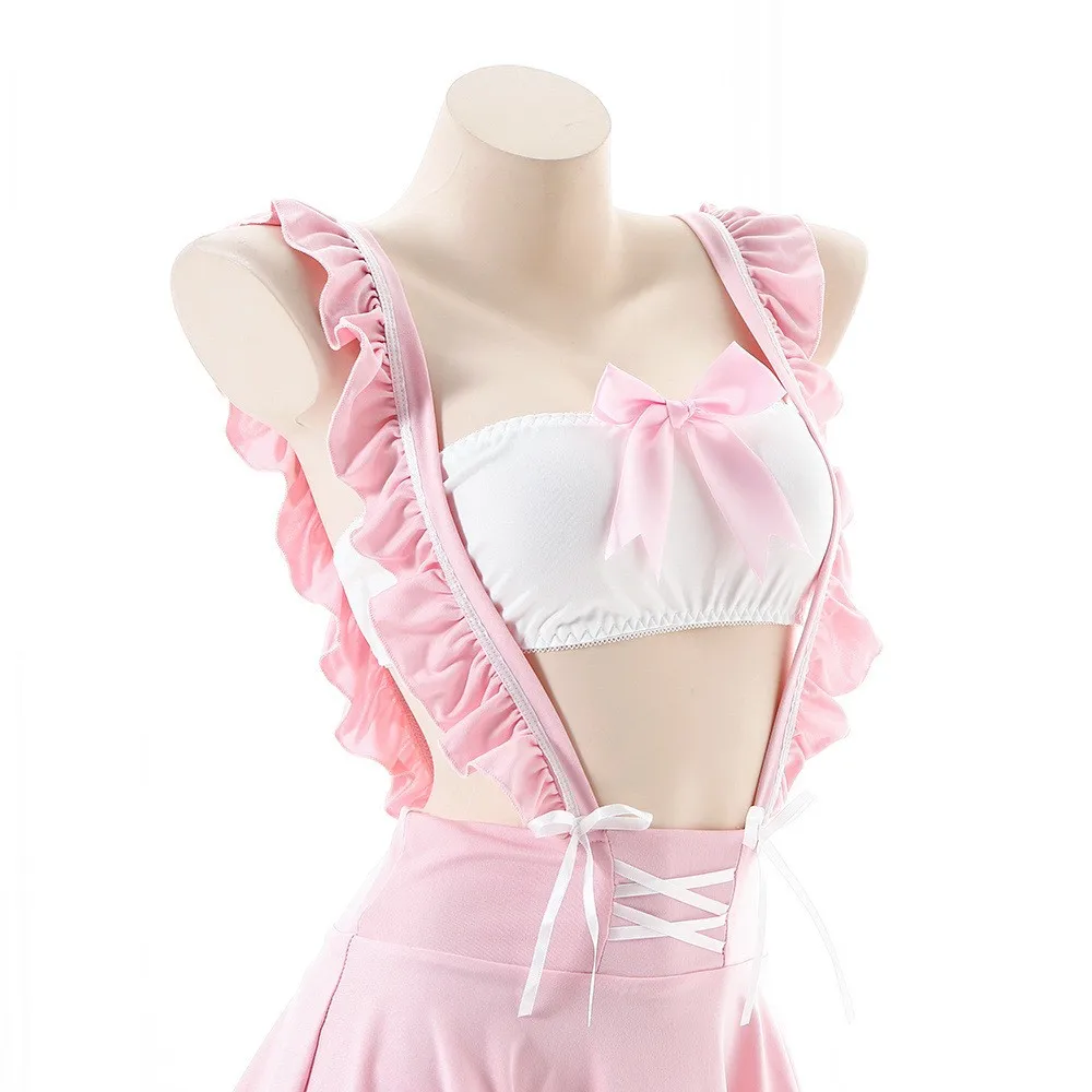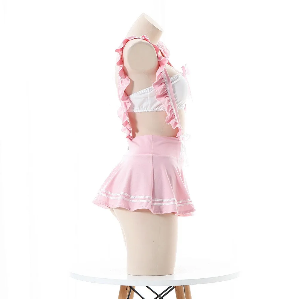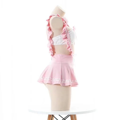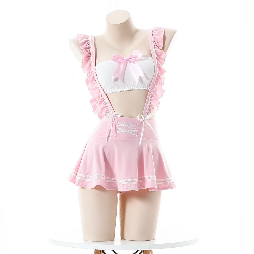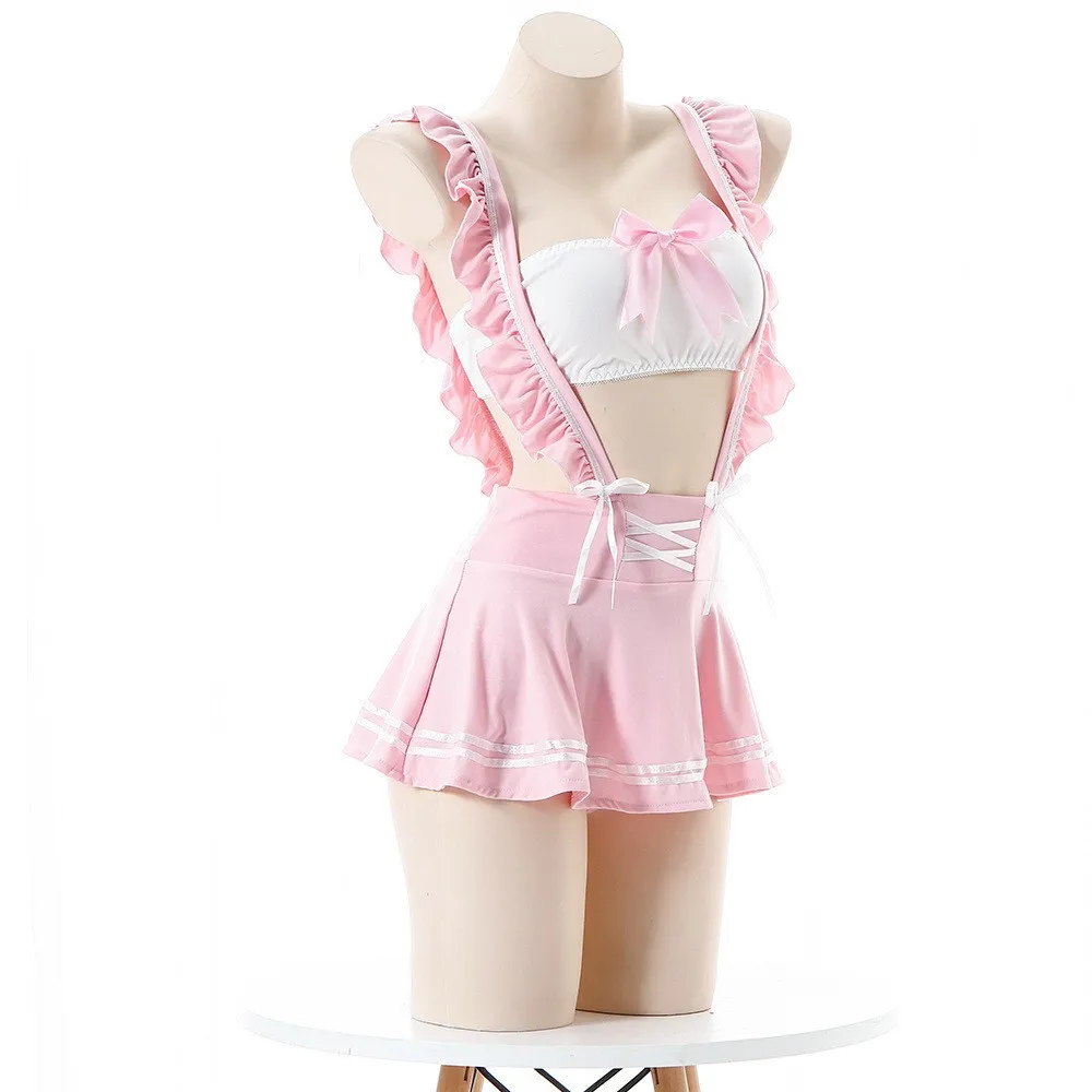 Com um design inspirado no estilo Lolita, esta lingerie apresenta um babydoll delicado, adornado com babados e uma fita encantadora que valoriza a silhueta feminina. O vestido tube sem encosto destaca as curvas, enquanto a minissaia traz um ar jovial e desinibido, perfeito para ocasiões especiais ou festas temáticas.