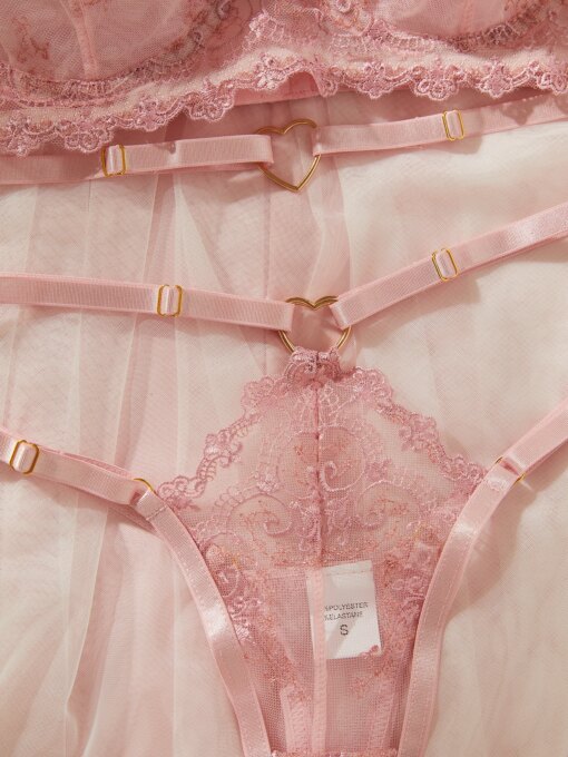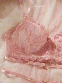 O conjunto inclui peças íntimas com bordado refinado e recortes estratégicos, valorizando o corpo com elegância e provocação. A estética romântica e mágica transforma a experiência íntima em algo visualmente encantador e emocionalmente envolvente.