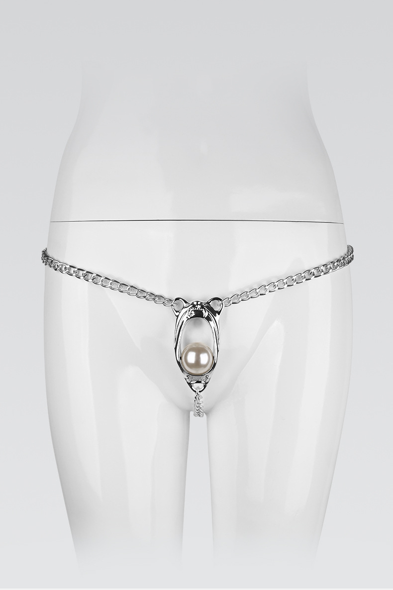 Cinta de castidade feminina de correntes. Boca de metal com pérola enorme.