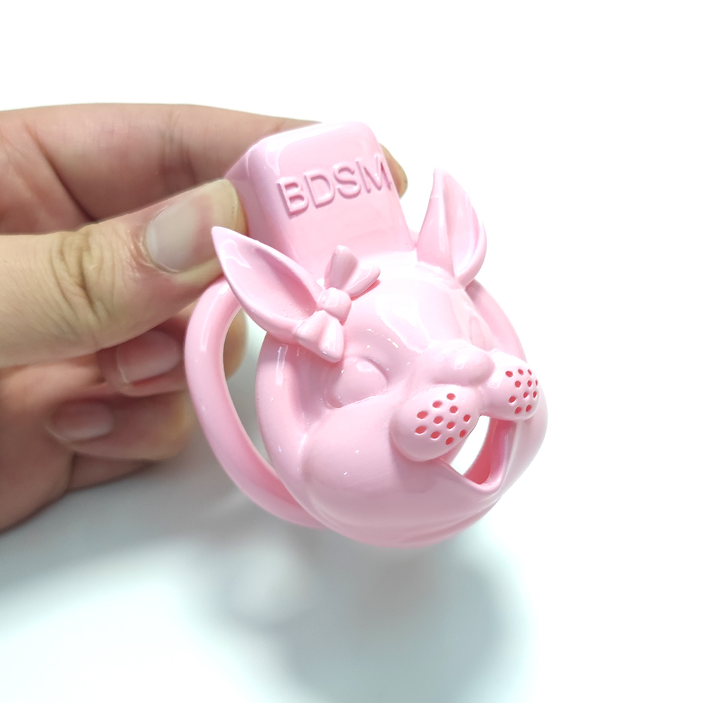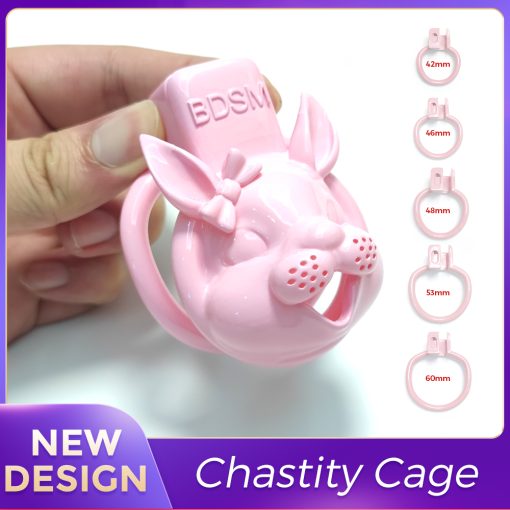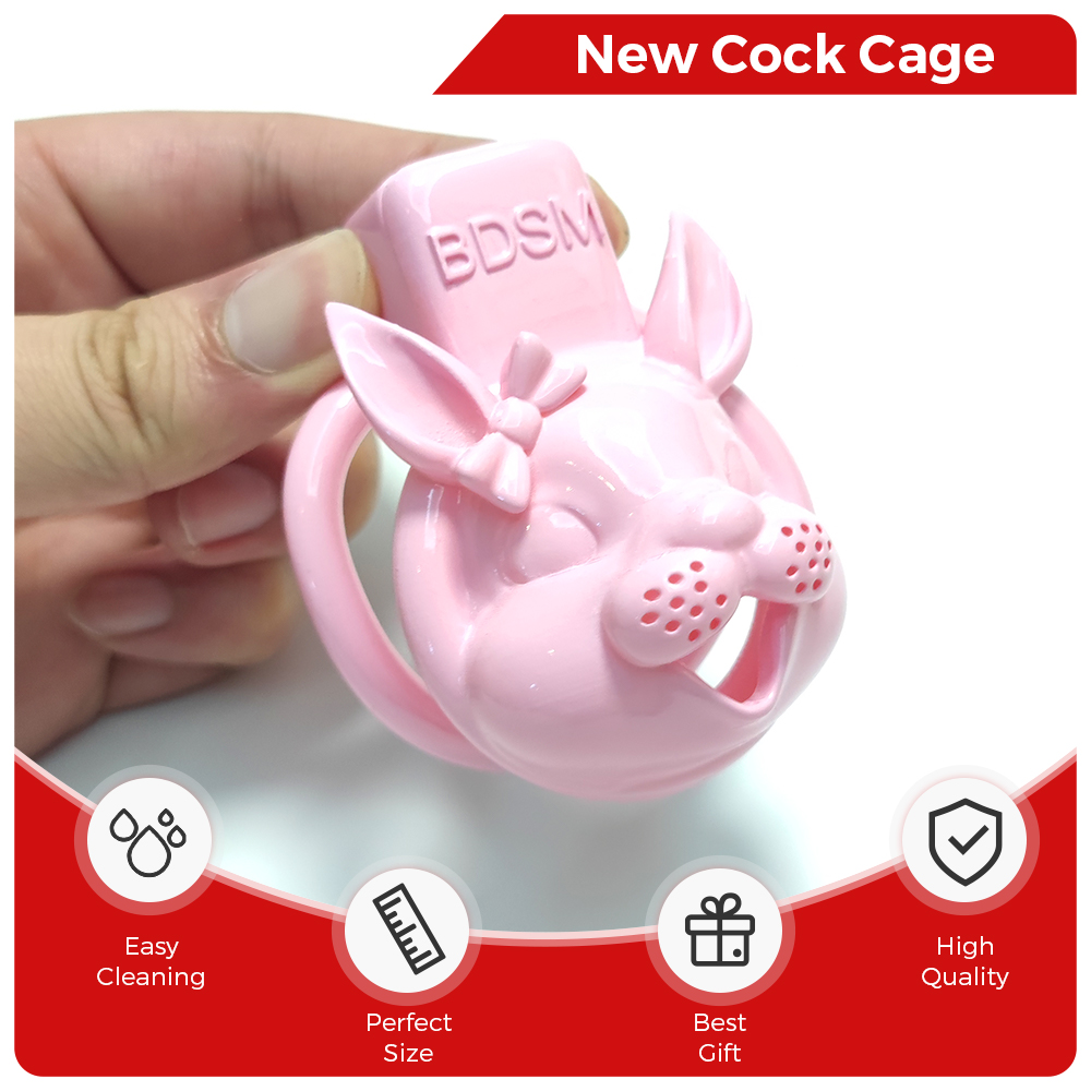 Gaiola de castidade com cabeça de coelho rosa e tamanho único. São 5 anéis de base com uma grande variedade de diâmetros e curvados para seu conforto. Modelo de cinto compacto, pesando aproximadamente 80g de plástico ABS.