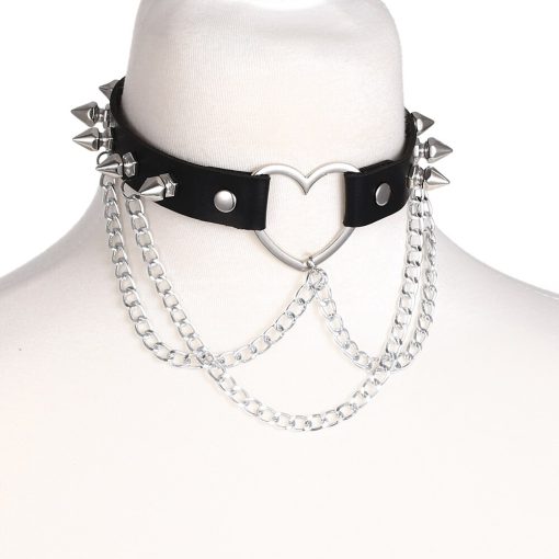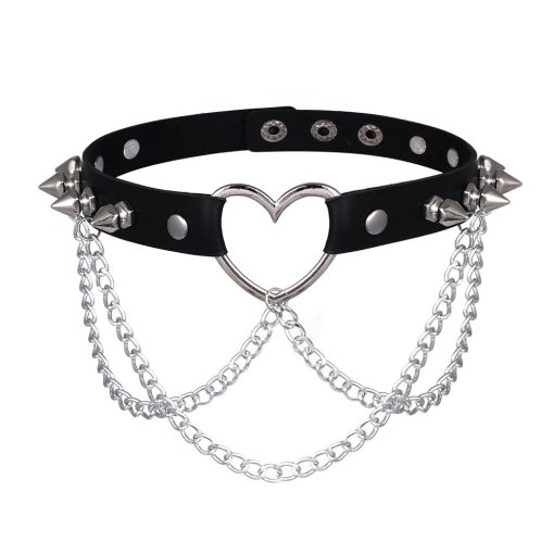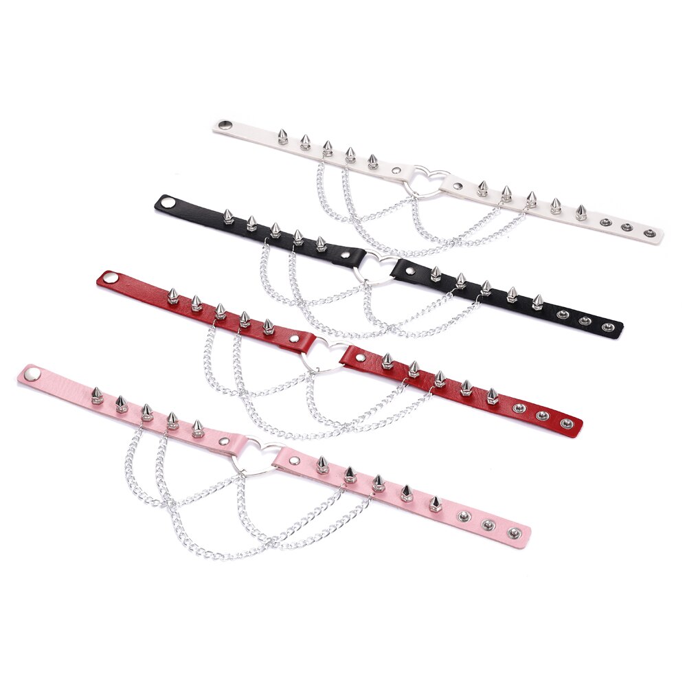 São colar e peças de beleza e suavidade, com tiras de couro em várias cores. Possuem detalhes com corrente duplas que abraçam o pingente de coração. Detalhes metálicos com espinho.