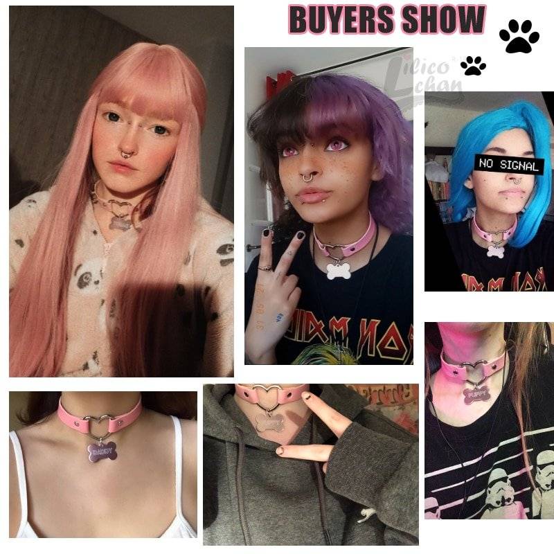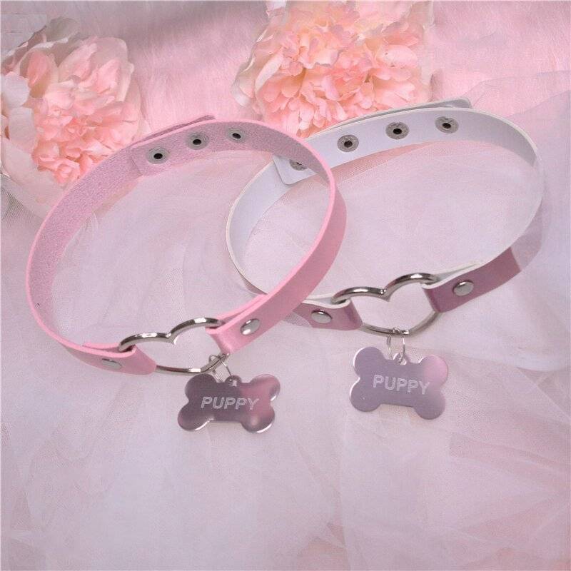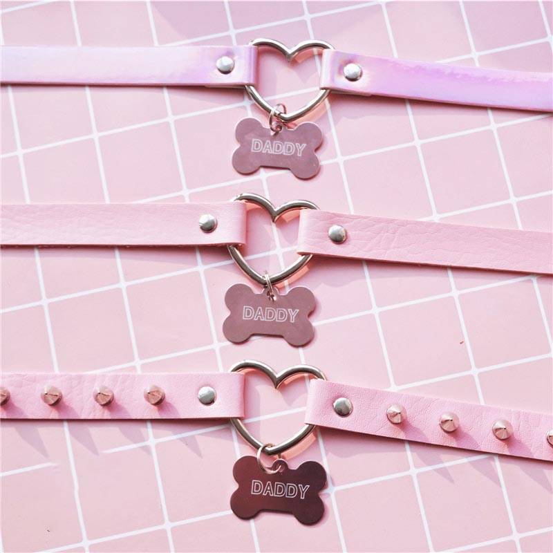 Colares feitos em couro sintético com pingentes de coração e pequenos desenhos de ossinhos. Os pingentes em formato de osso têm as palavras puppy ou daddy escritos. Podem ser colares com um estilo fofo ou usados para fetiches de dominação.
