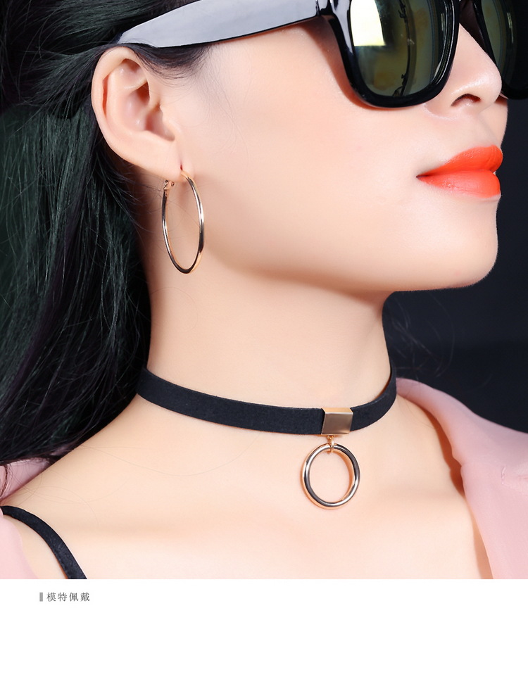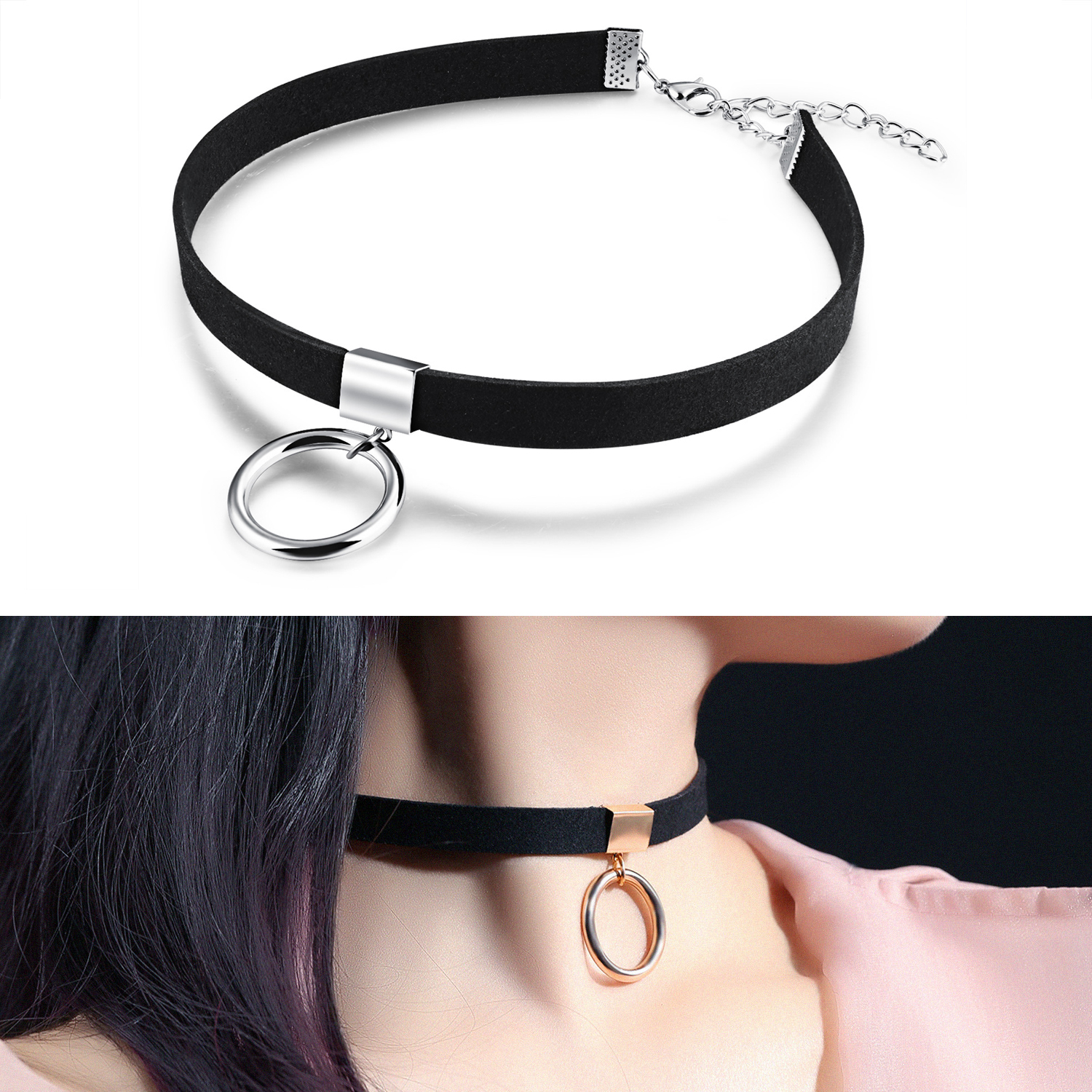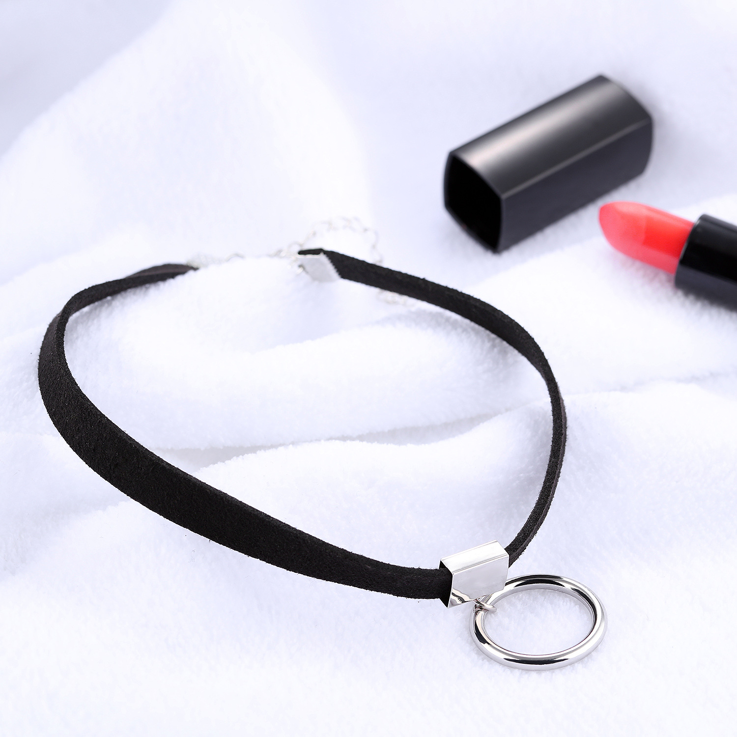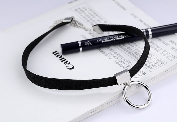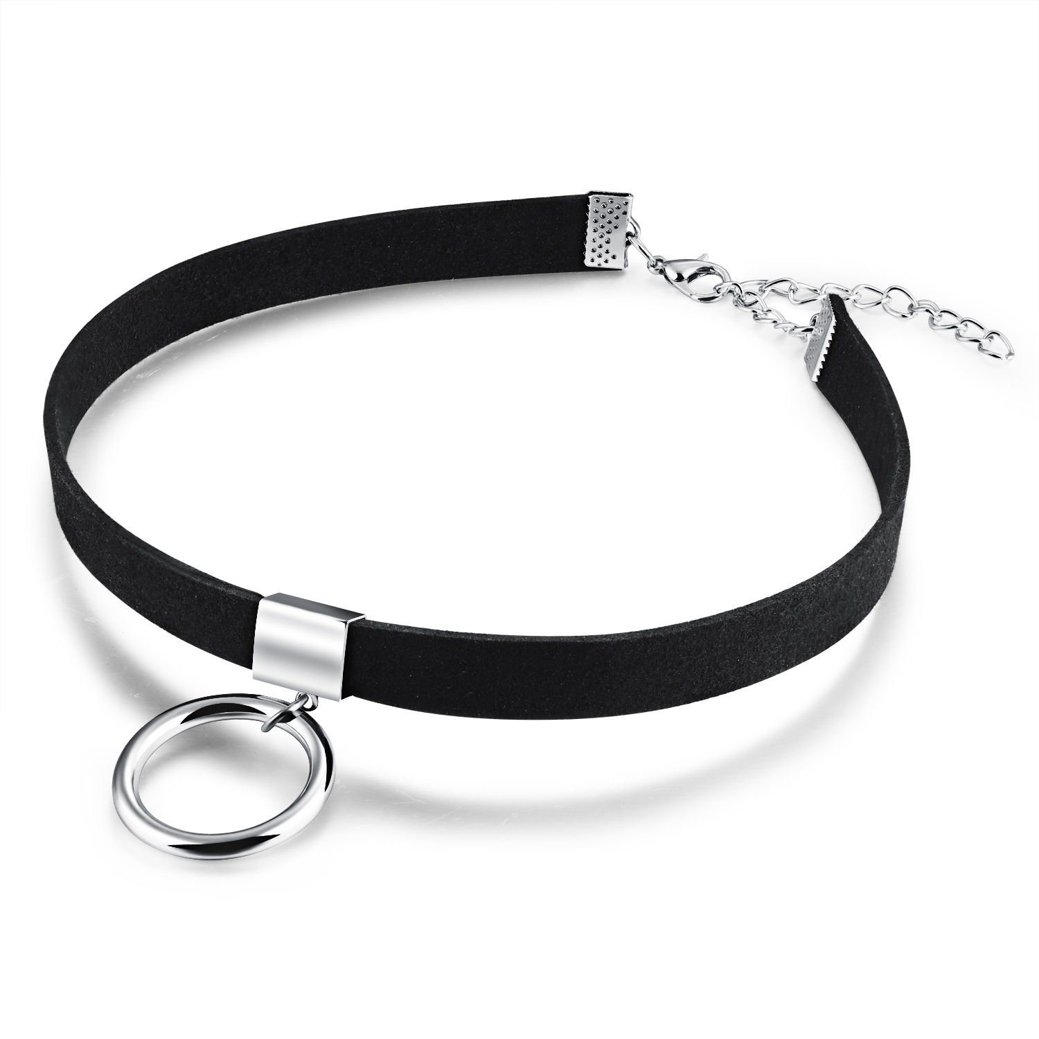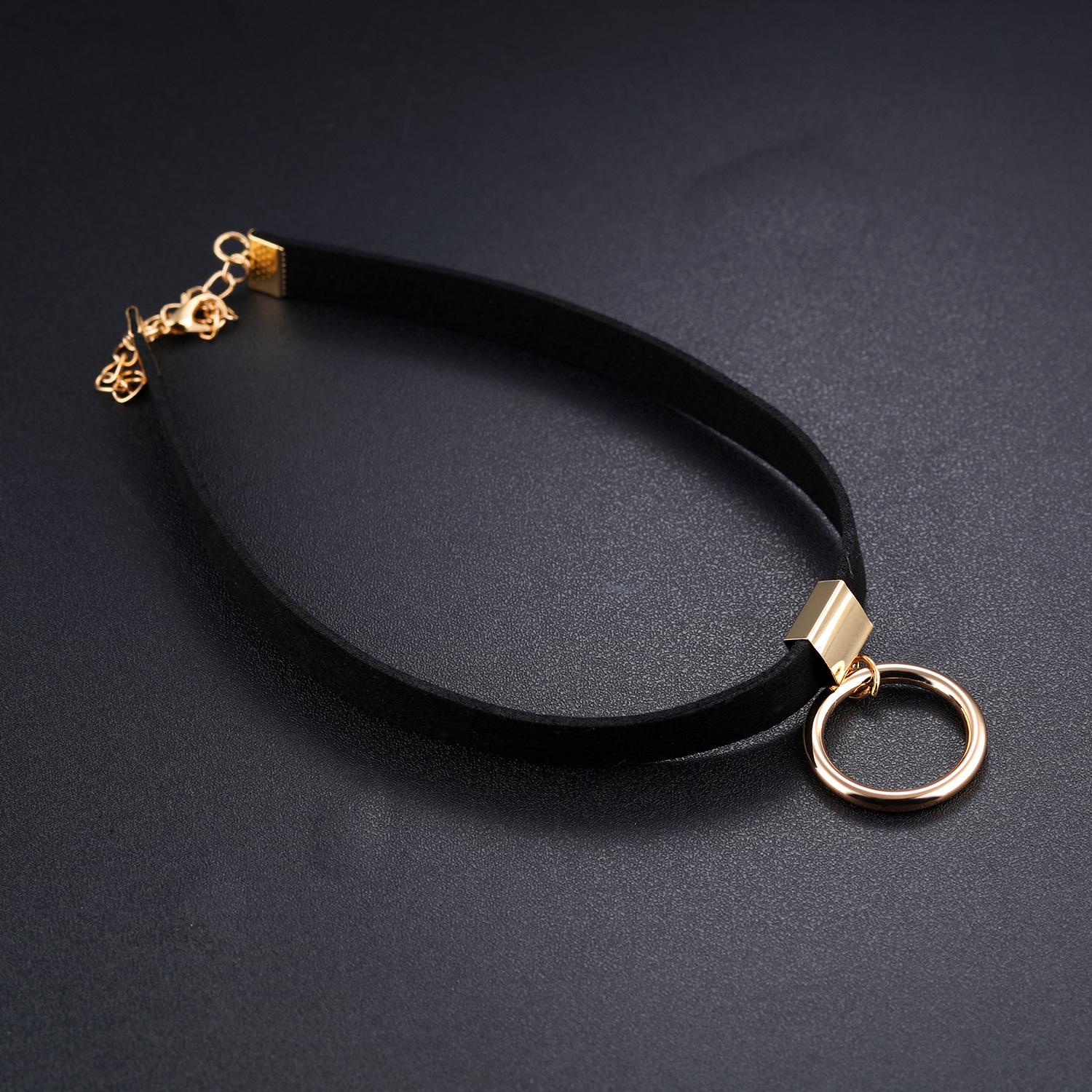 Gargantilhas com tiras de couro sintético e pingente de argola.
