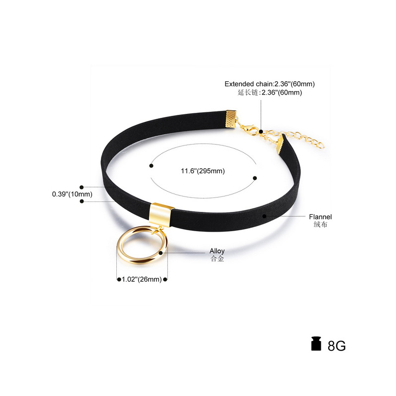 A gargantilha tem medidas de 29,5 cm de circunferência, podendo ser estendida por mais 6 cm pela corrente e fecho de gancho. Tem 1 cm de altura para a tira de couro e argola com 2,6 cm de diâmetro.