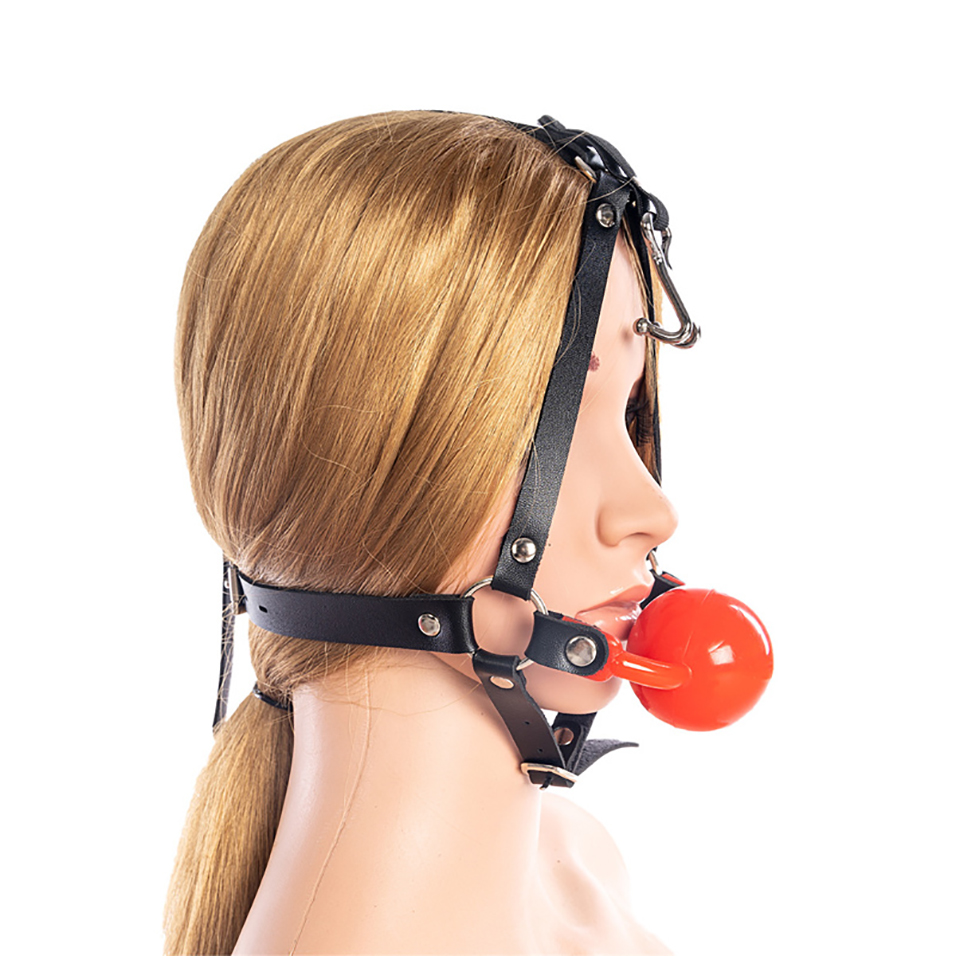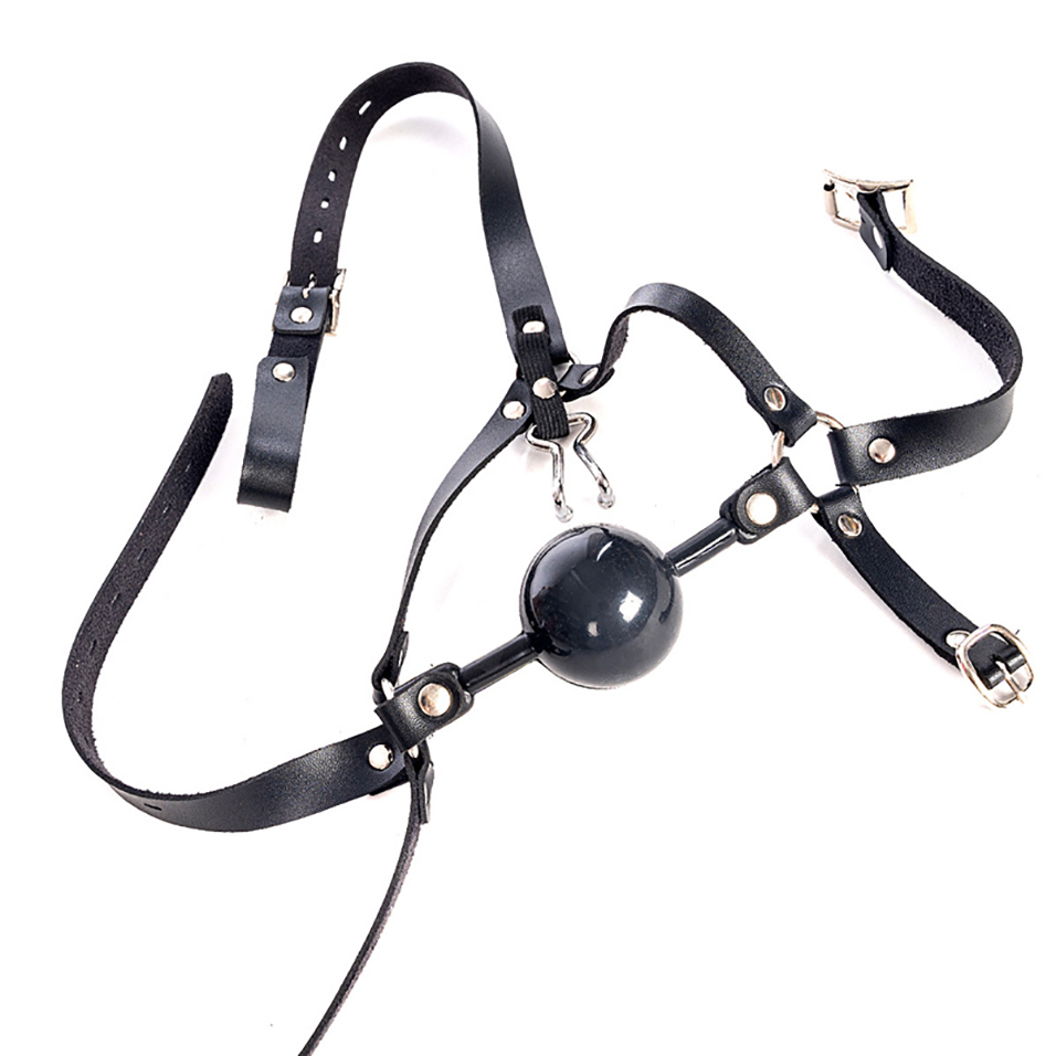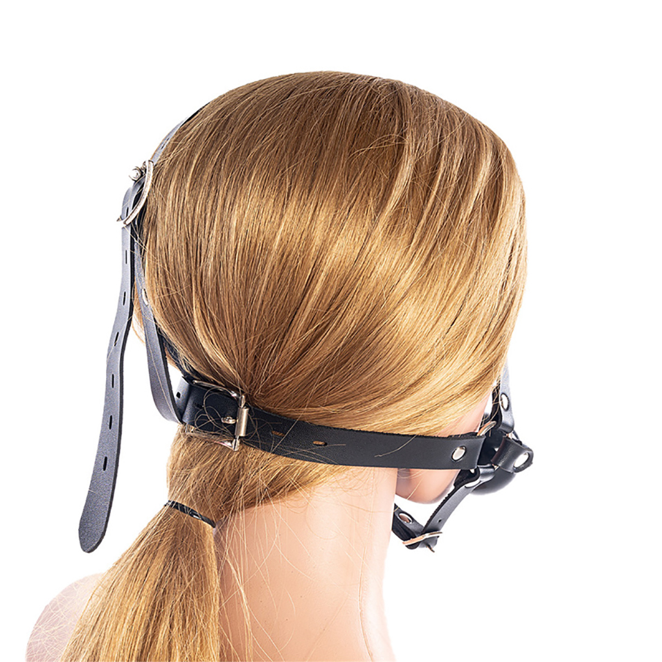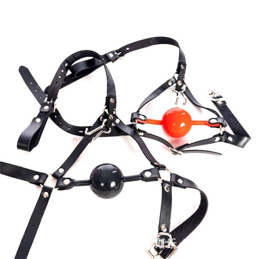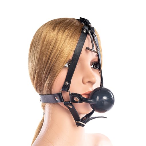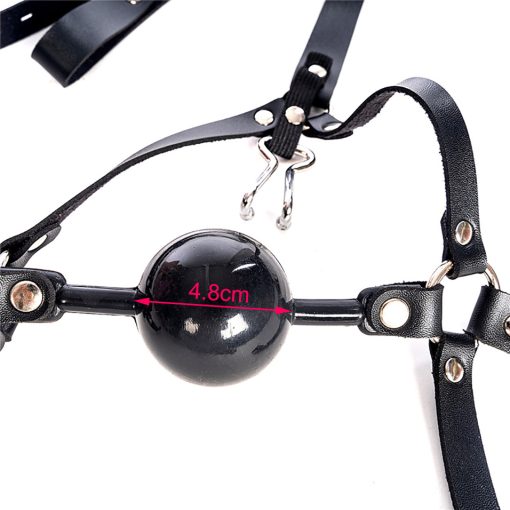 Máscaras de couro em formato de focinheiras com bola de borracha de mordaça na frente da boca e ganchos para o nariz. Estes ganchos servem para que garanta que a pessoa está “respirando adequadamente”, além de manter a máscara firme no lugar devido. Torne seu escravo mudo com esta mordaça dentro da boca. A mordaça não é removível das tiras de couro.
