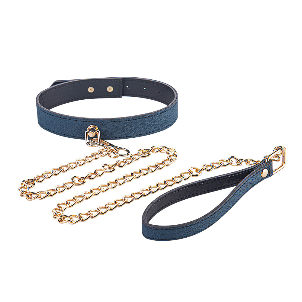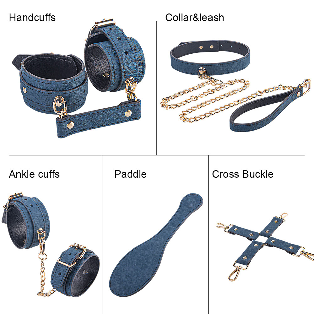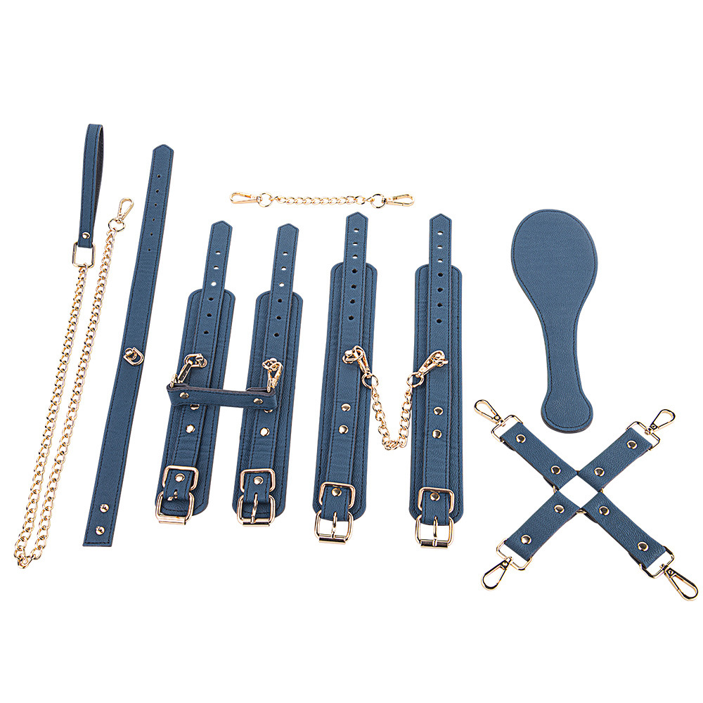 Conjunto para fetiches ou BDSM. Couro grosso e azul e te faz ver estrelas.
