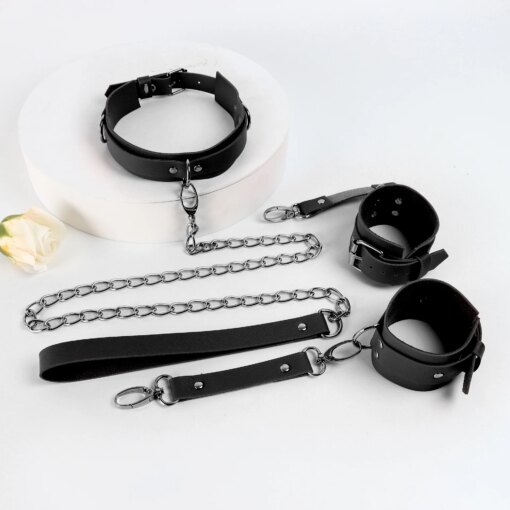 Kit Bondage BDSM Couro Algemas Tornozeleiras e Coleira Restrição SM