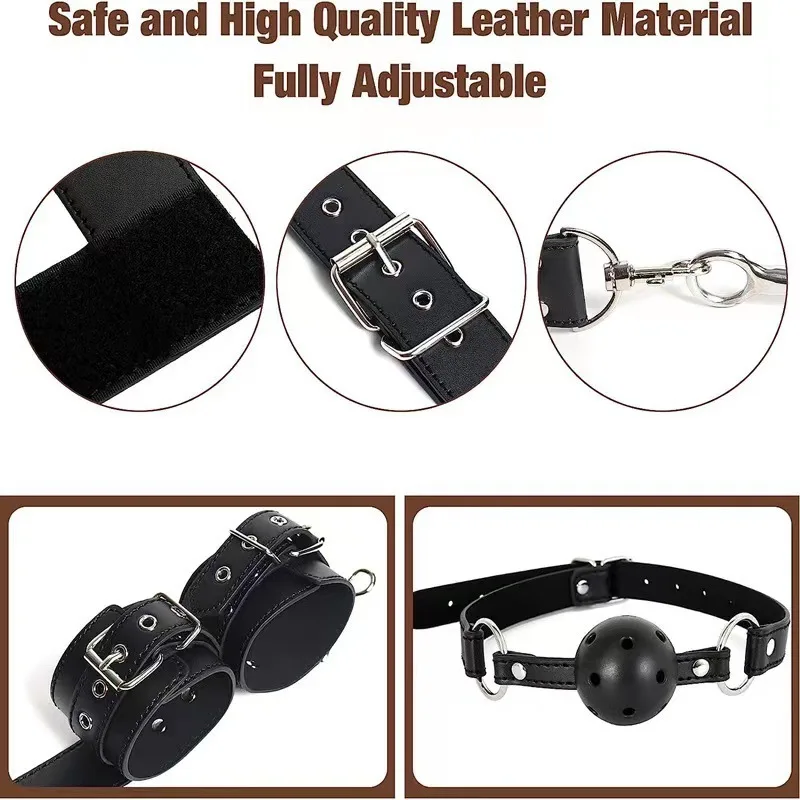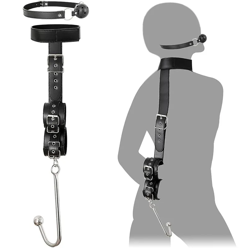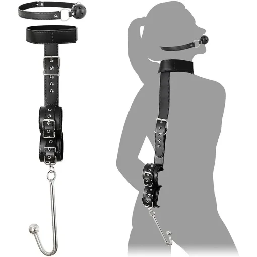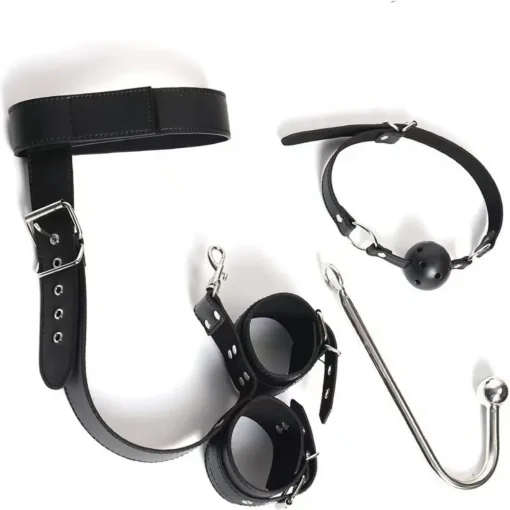 Este conjunto reúne três acessórios essenciais para jogos BDSM: uma mordaça para controle total da voz, algemas para restrição de movimentos e um gancho anal que adiciona um nível extra de dominação e estímulo.