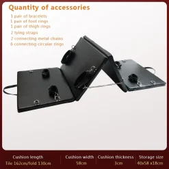 Kit Colchão Algemas Correntes SM Bondage: Leve a intimidade para outro nível com este kit, ieal para casais que desejam explorar novas formas de prazer e conexão. Esse kit completo transforma qualquer espaço em um playground para jogos de poder e entrega. Composto por uma base acolchoada de 172 cm, ele inclui algemas para pulsos e tornozelos, anéis para as coxas e uma variedade de acessórios de restrição ajustáveis para garantir conforto e segurança durante o uso.