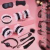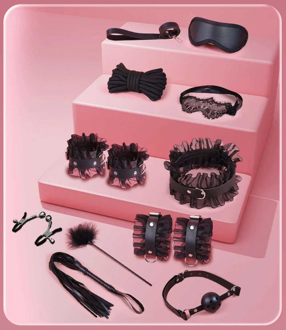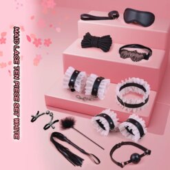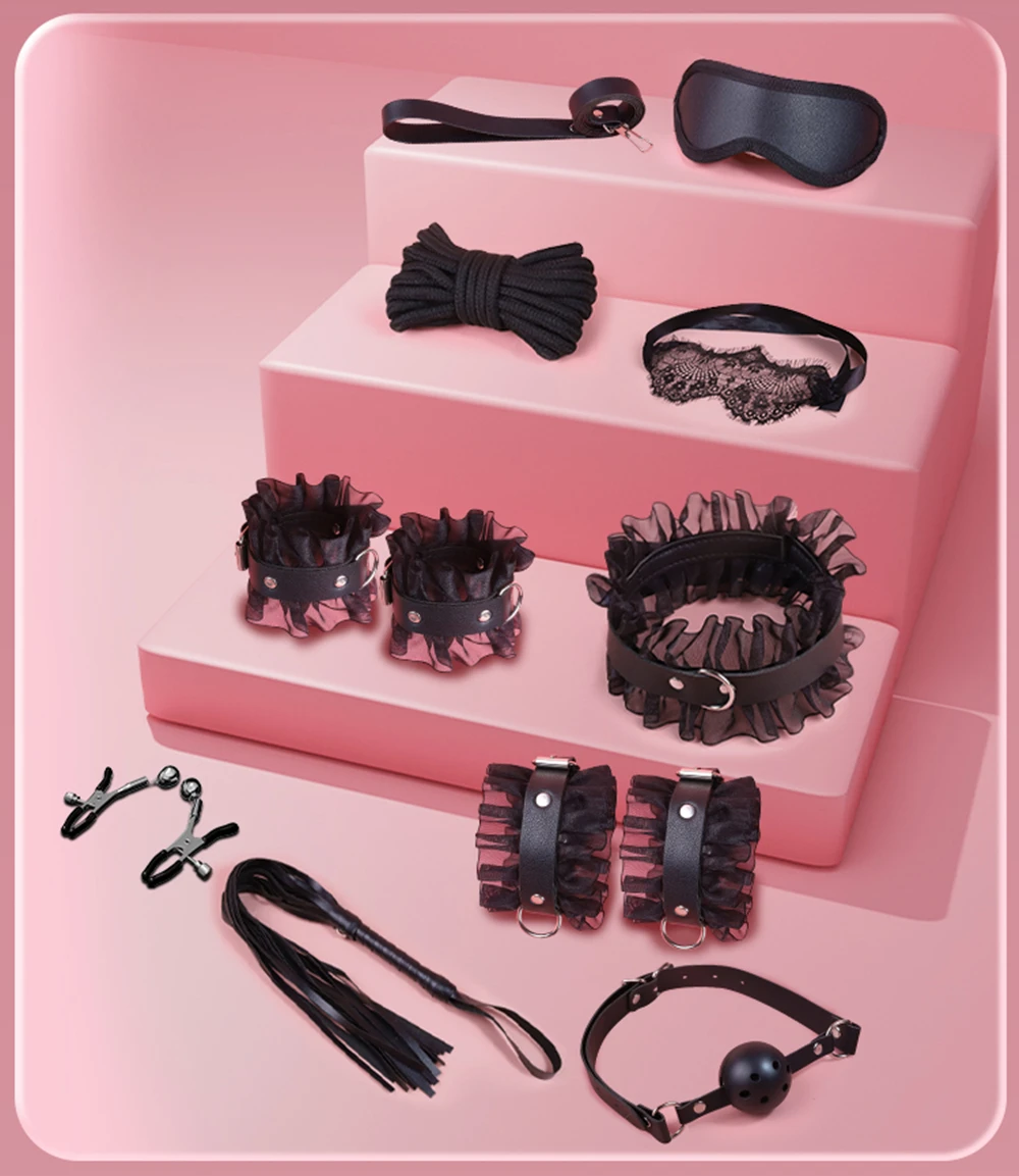 Upgrade Lace Bondage Restraints Kit – Mouth gag, Cotton rope, Collar, Nipple clamps, Handcuffs, Ankle cuffs, Eye mask, Flirt stick, Whip.