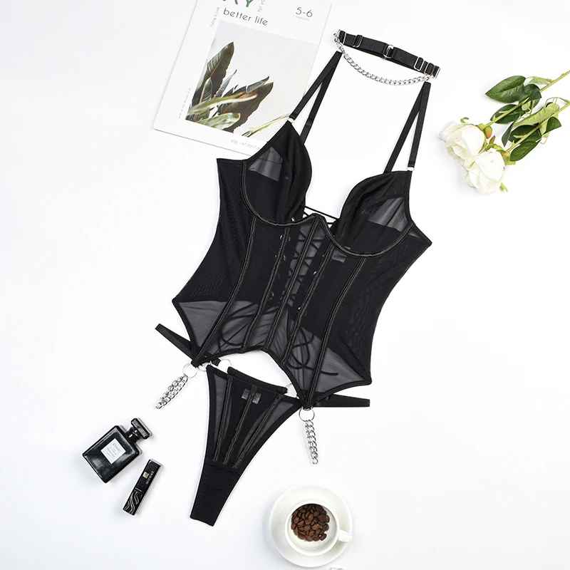 Aumente sua confiança com a lingerie 3 peças com espartilho da Ellolace, uma fantasia sexy que combina ousadia e sofisticação. Com design sem costas e acabamento em renda delicada, esse conjunto preto valoriza suas curvas com sensualidade e elegância.