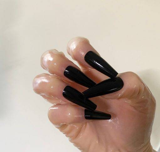 Luvas de látex com unhas postiças em diversas cores e tamanhos.