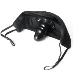 Máscara de tecido, com elásticos para as orelhas. Possui pequeno plug em formato de pênis para a boca. Além disto, a máscara possui regulagem por presilhas de plástico nas cordas laterais.