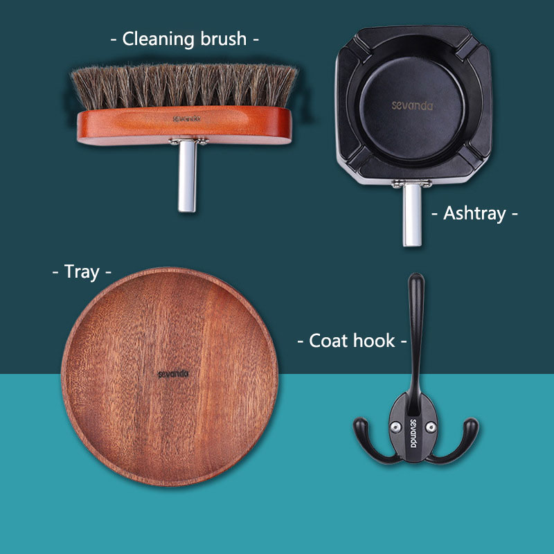 Um limpador de privadas com cabo de metal, um suporte para rolo de papel higiênico, um funil para urinar, um esfregão com conexão de metal na parte do cabo, um cinzeiro, uma bandeja de madeira e um gancho triplo de suporte para roupas.