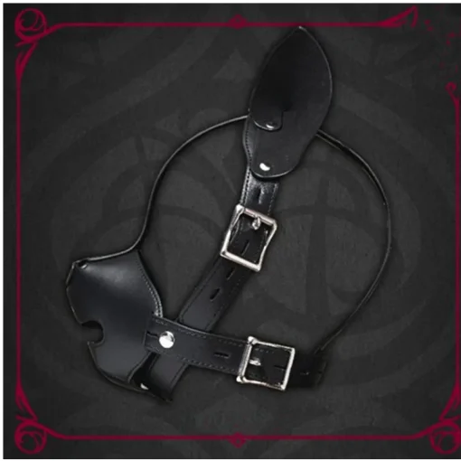 Feita de couro falso de alta qualidade, a máscara oferece um ajuste confortável e seguro, disponível em dois tamanhos: Pequeno, para pescoços de até 38 cm, e Grande, para pescoços de até 48 cm.