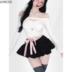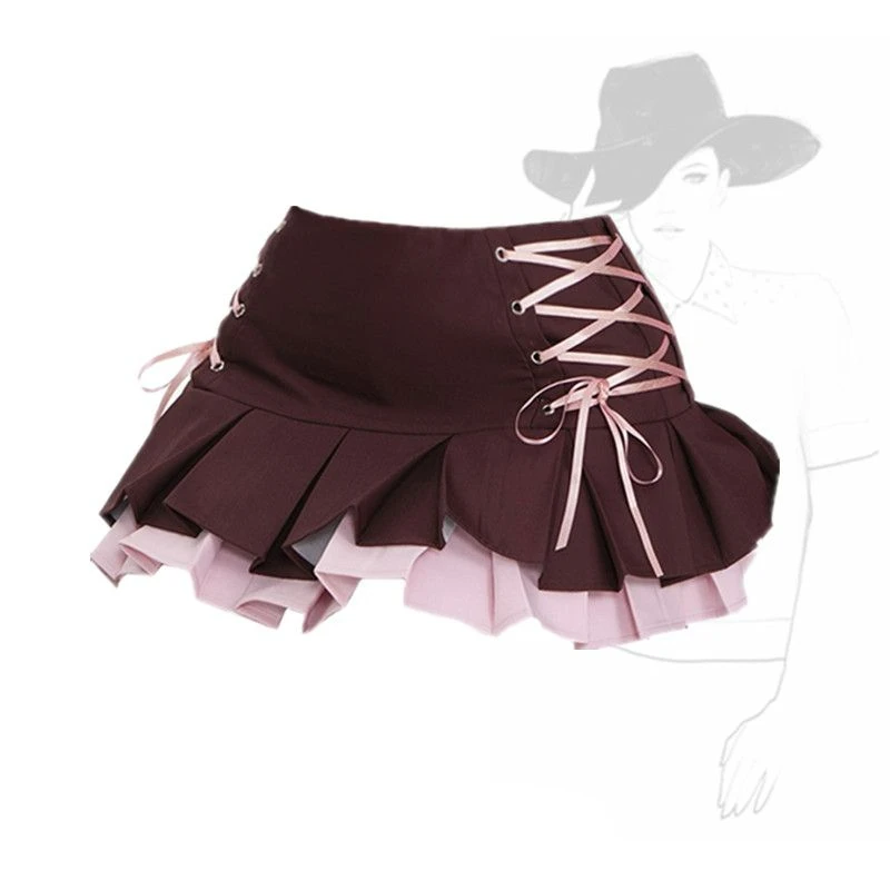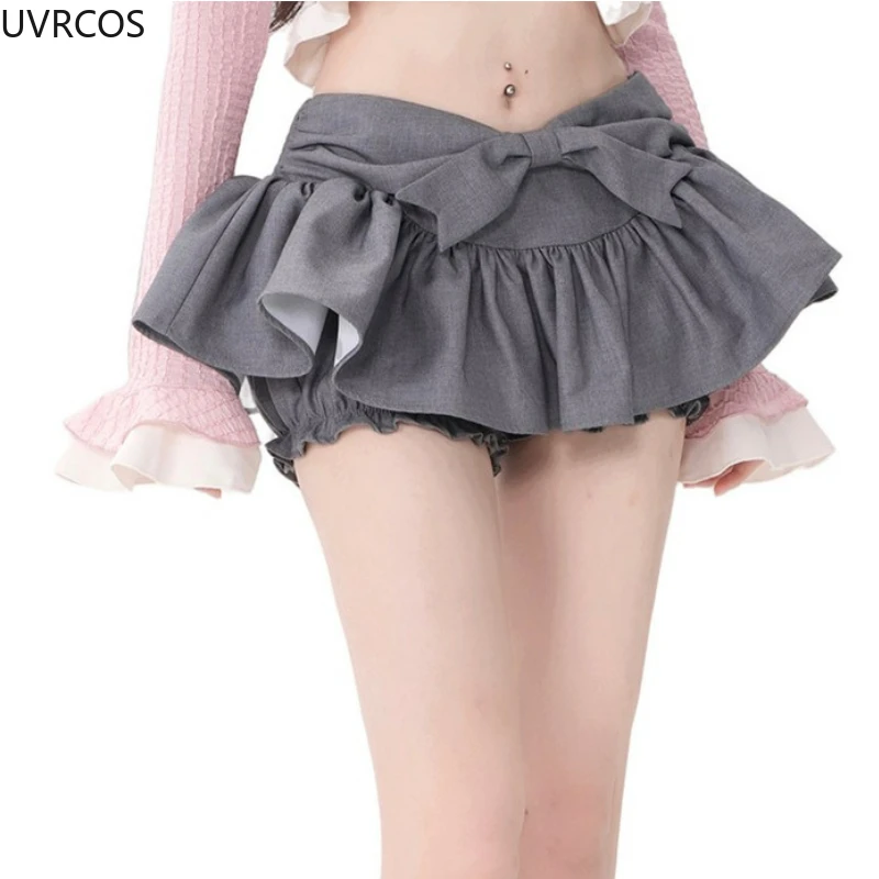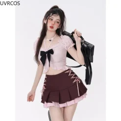 Esta saia é um novo japonês Kawaii Bow Lolita Mini saia desenhado pelo designer. É muito bonito Mulheres Y2k Cintura Alta Bandagem Rosa Saias Plissadas
