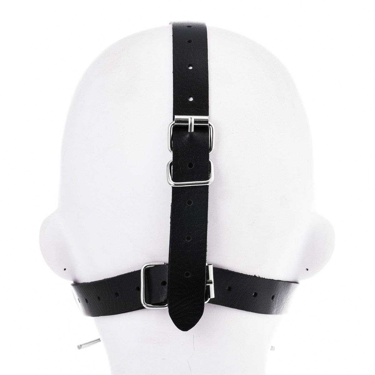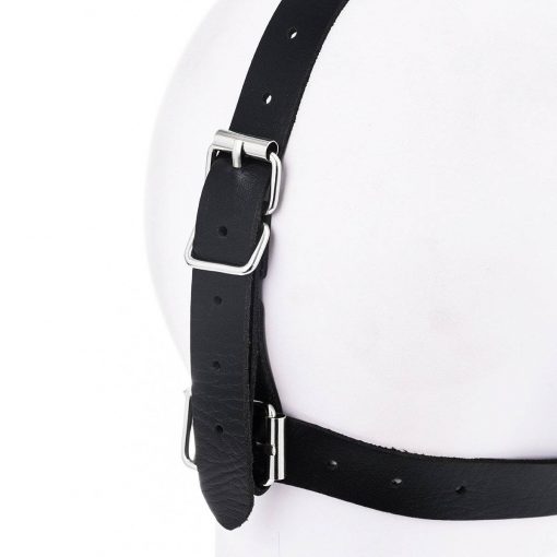 Para a fixação firme desta mordaça, foram usadas tiras de couro sintético e peças de metal, como fivelas e tachas.