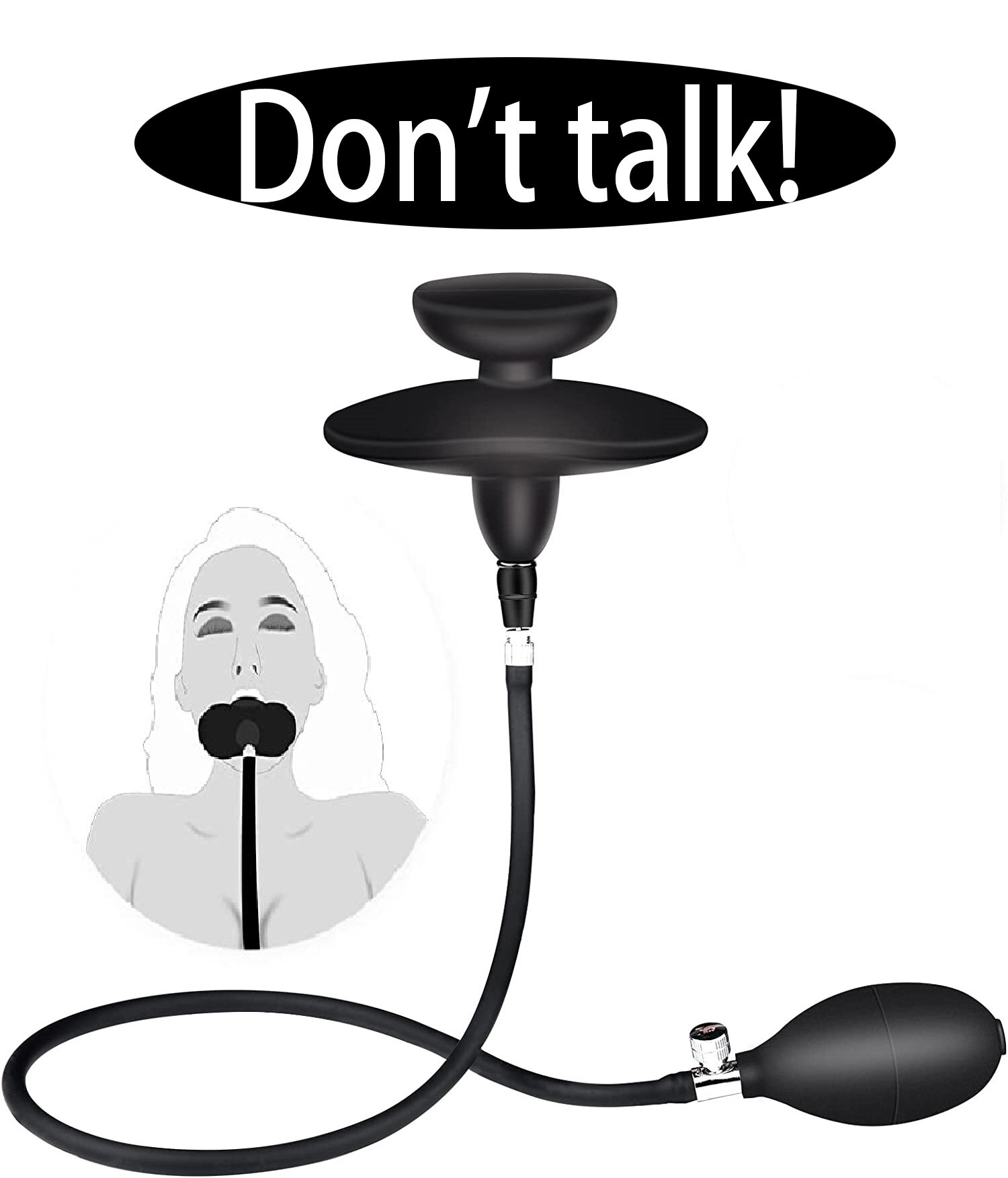 Modelo de mordaça inflável sem fivelas, seu design é planejado para que após inflada dentro da boca, seja difícil de ser removida se não for desinflada.
