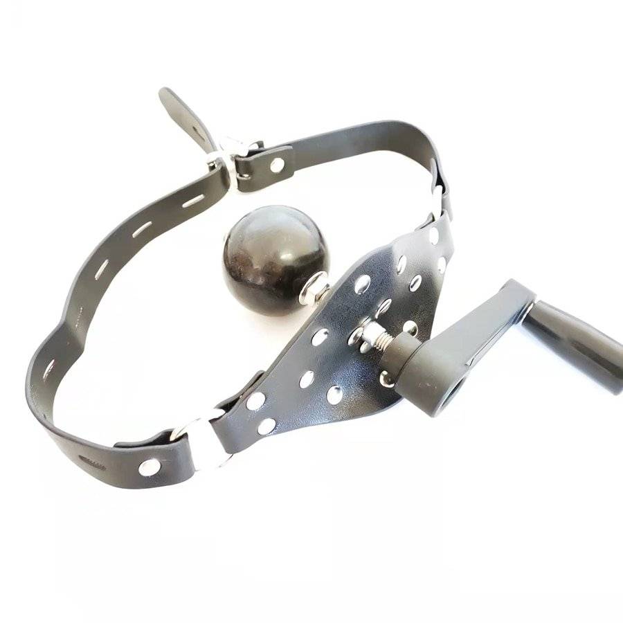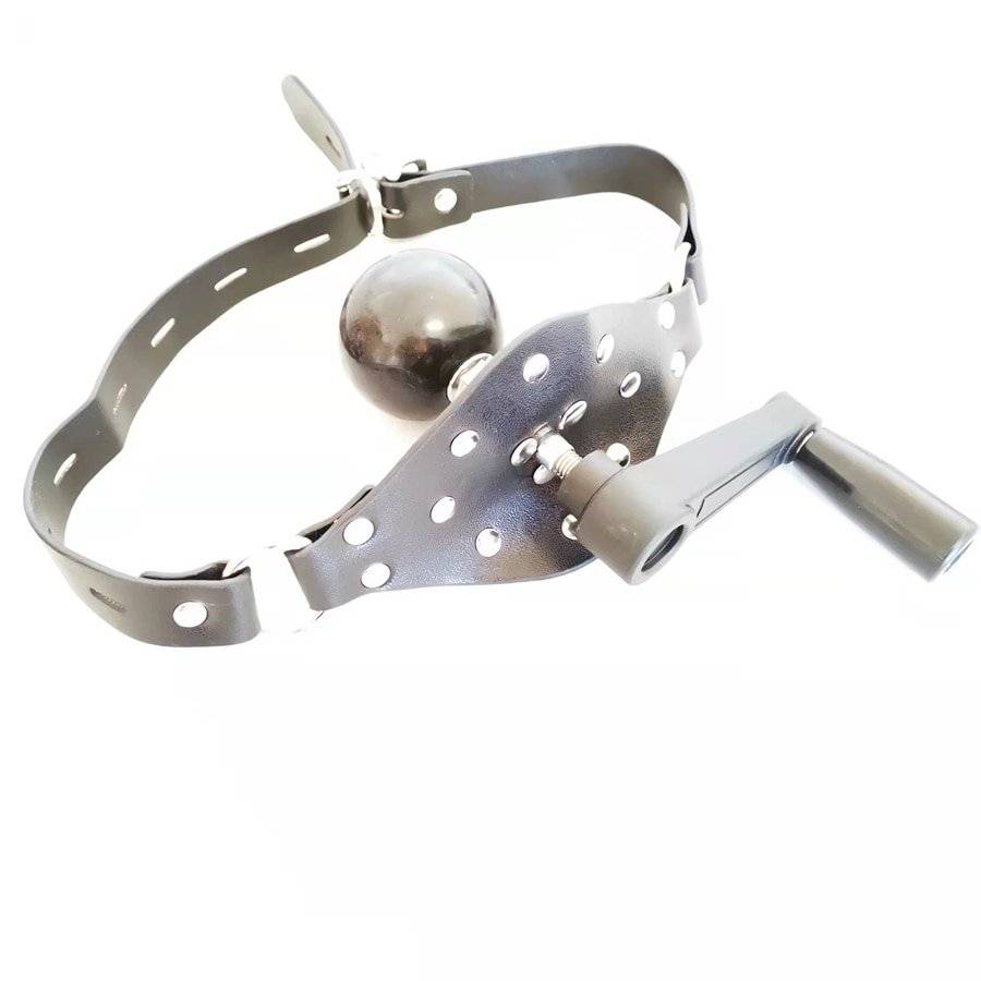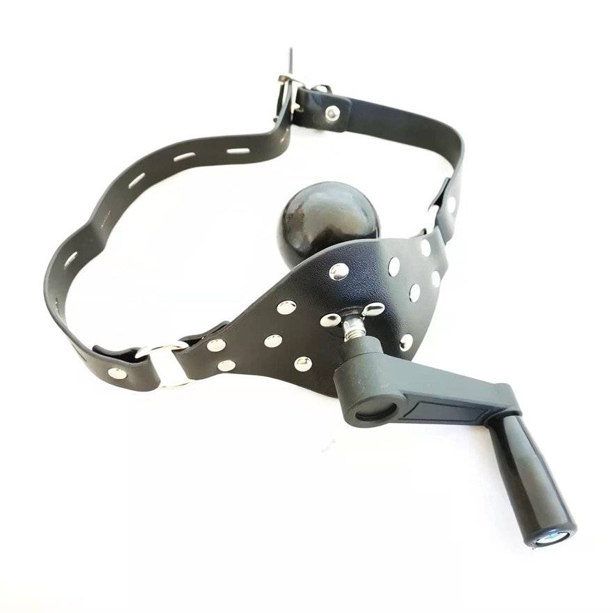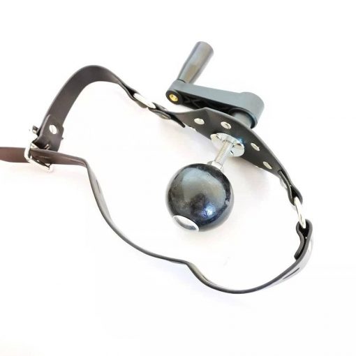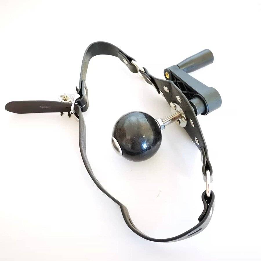 Mordaça com mecanismo para abrir a boca, feitos com bola de silicone e uma alavanca para compressão e tração.
