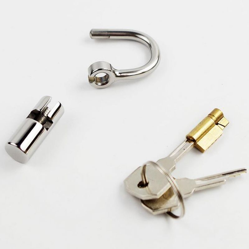 Cadeado de castidade de tamanho único, pequeno e com formato semicircular. Tranca metálica para disposição genital.