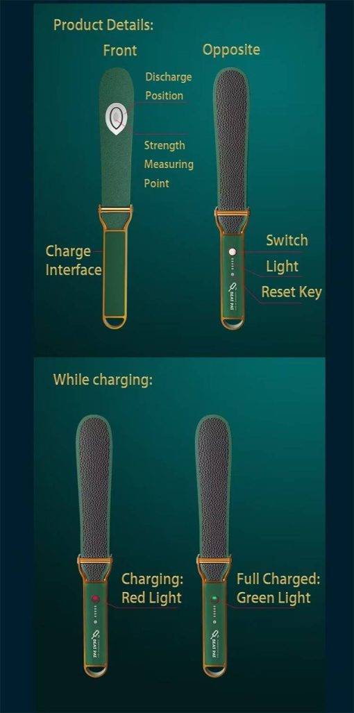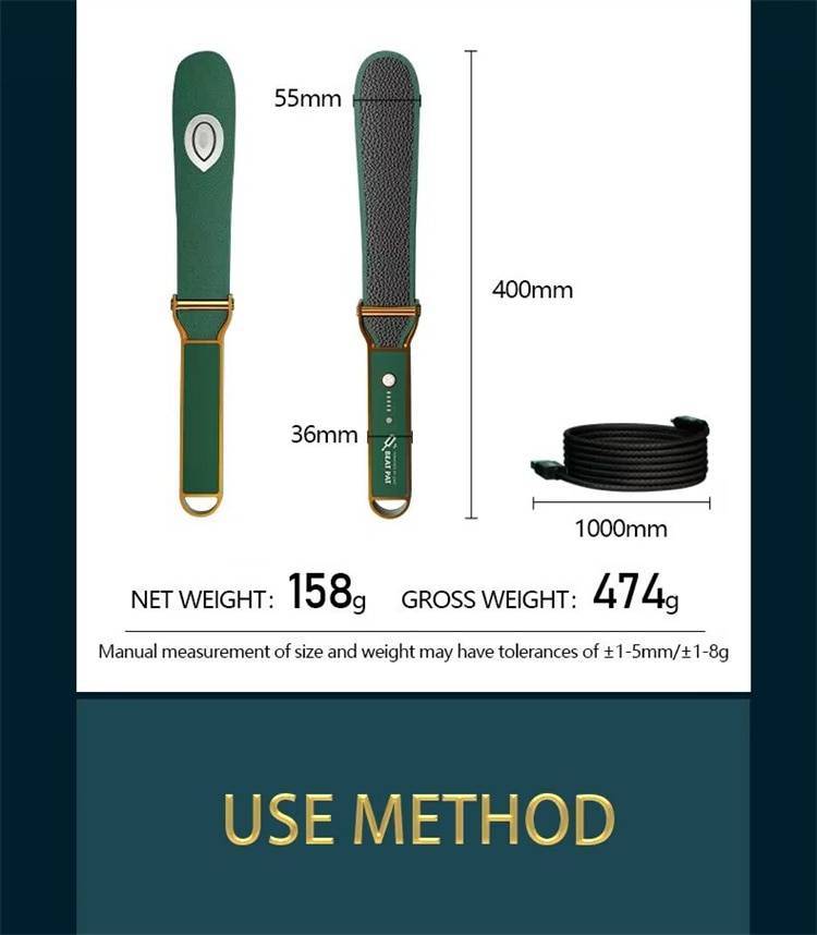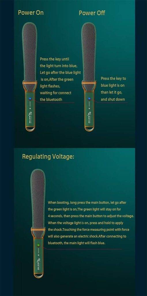 Função do produto: Choque elétrico (a força pode ser regulada, para iniciantes ou experientes); Choque elétrico de pressão (regula a intensidade da corrente junto com a força da palmada, a batida forte, a eletrificação mais forte); Contagem de palmadas; Ritmo musical; Modo de vários jogos; Carregamento USB TIPO C; Jogo punitivo quantificável (registros de aplicativos em tempo real)