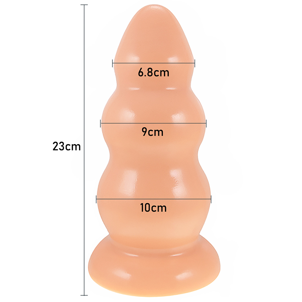 O item possui tamanho de 23 cm de altura. A grossura máxima do produto é de 10 cm de diâmetro. A primeira parte tem 6,8 cm. Possui uma base grande de ventosa para suportar seu grande peso e formato. Vai garantir a estabilidade do plugue gigante.
