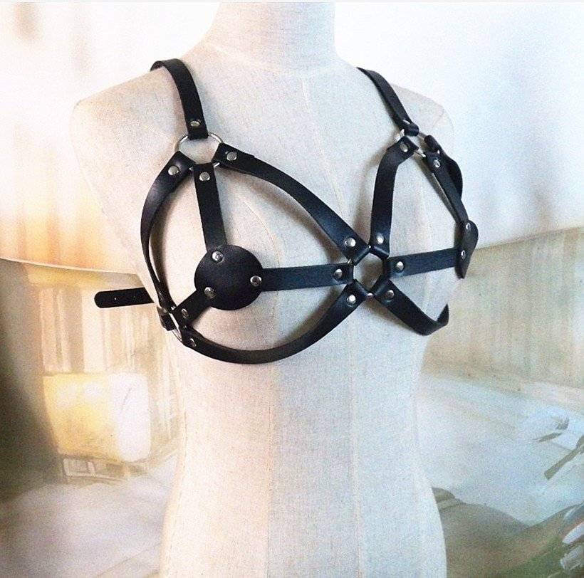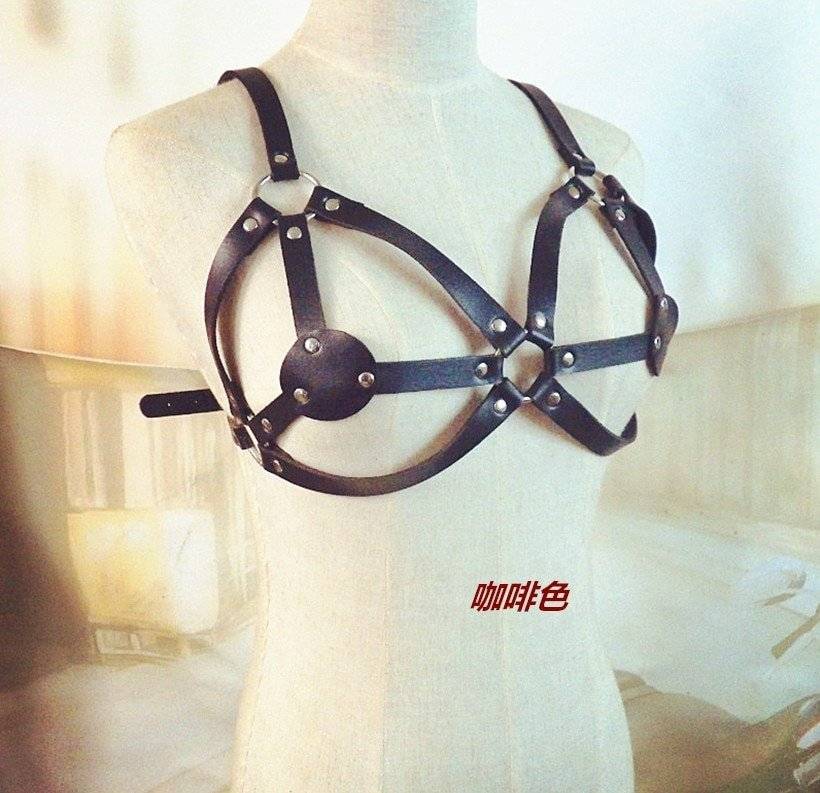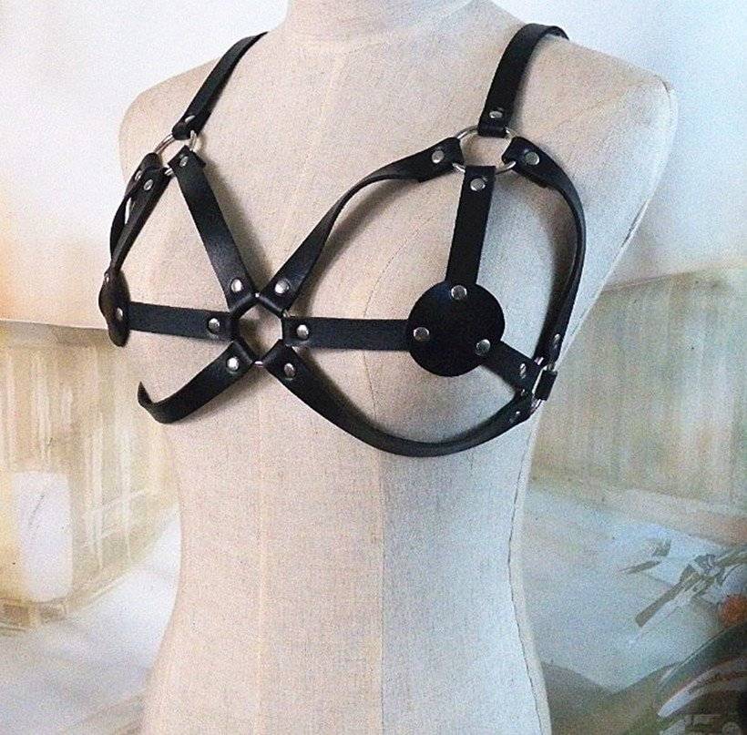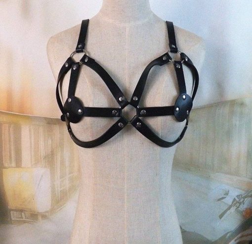 Sutiã BDSM de tiras de couro e argolas, frente em tamanho único.