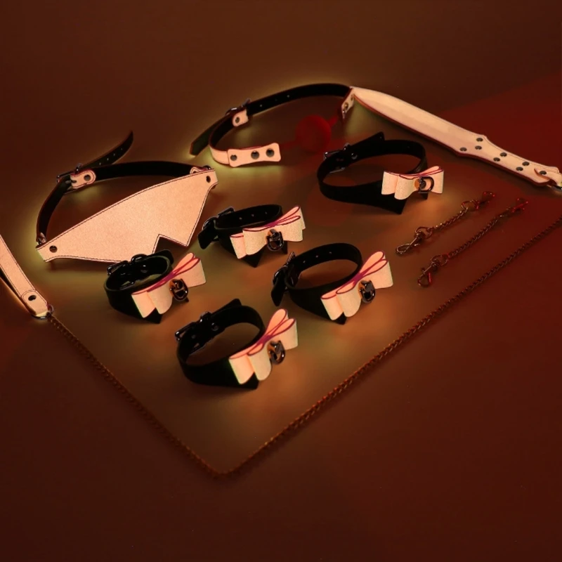Cada peça possui texturas sintéticas limpas e lisas, com proteção de material fluorescente para o couro de microfibras. Há também tratamento metálico de anodização dourada para as partes metálicas. Costurados com nylon e com taxas de metal. Suave ao toque. Certamente um conjunto durável que vai resistir até ao mais rebelde dos submissos. Nem mesmo no escuro os submissos vão conseguir se esconder.