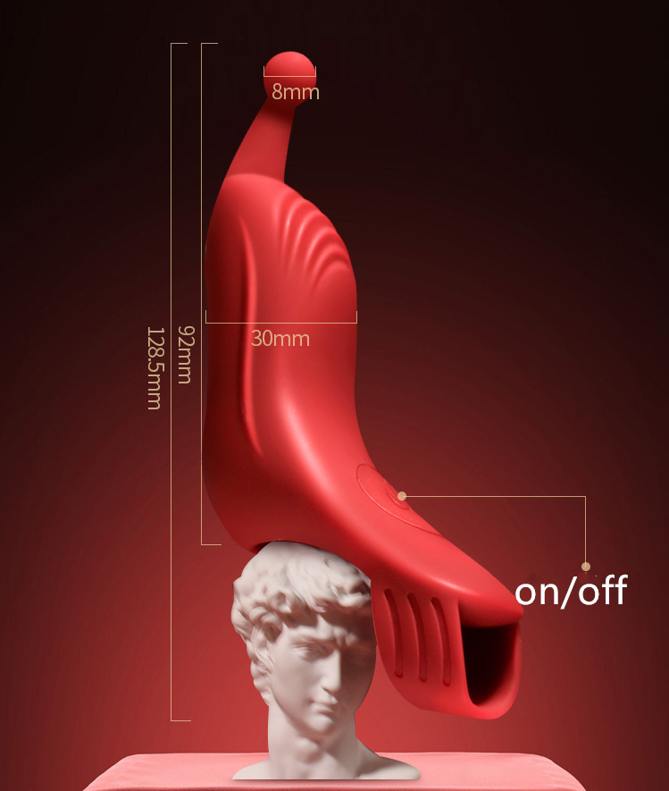 Um vibrador com curvatura e textura de dedo que pode ser vestido para facilitar a penetração ou masturbação pelo ser par.